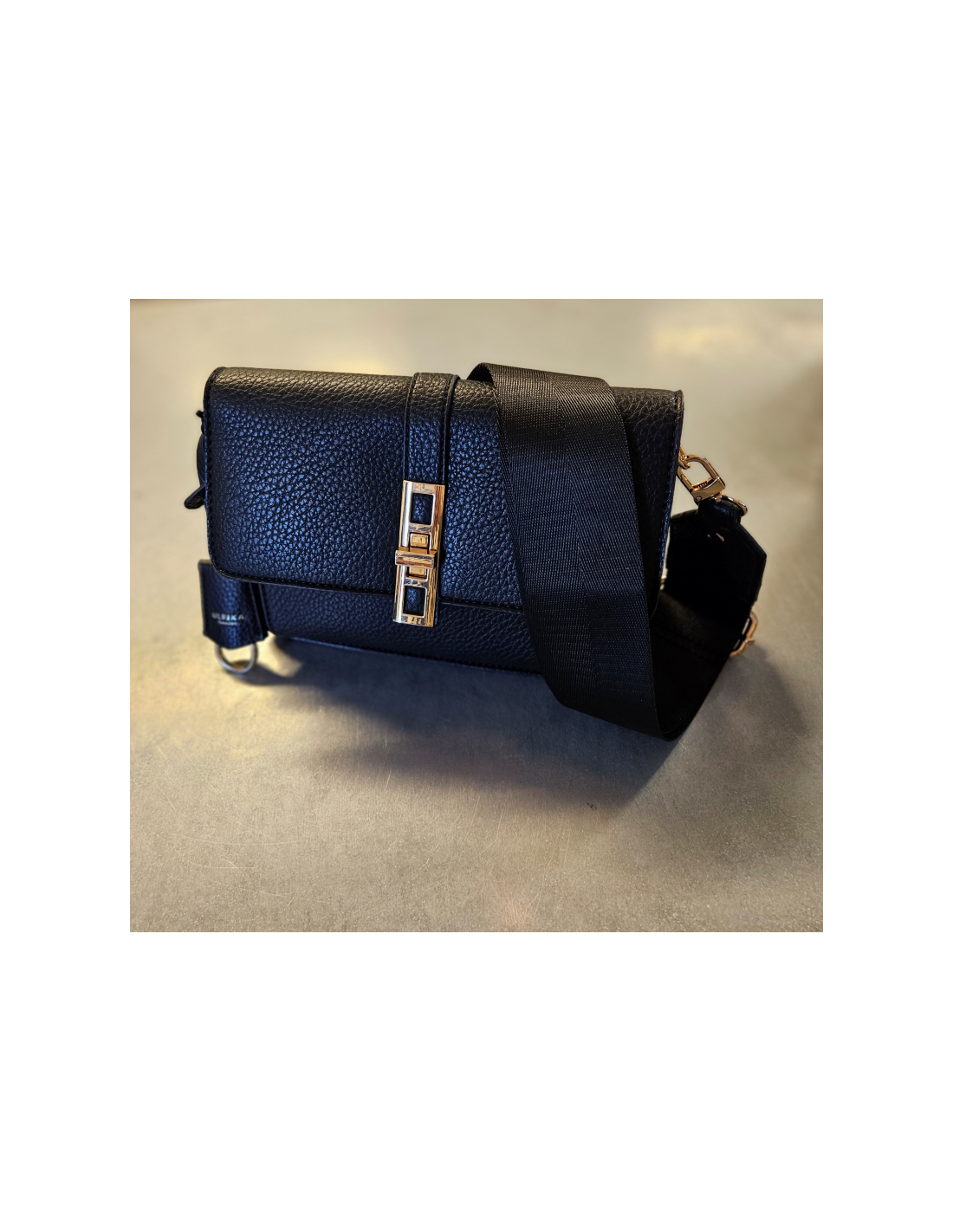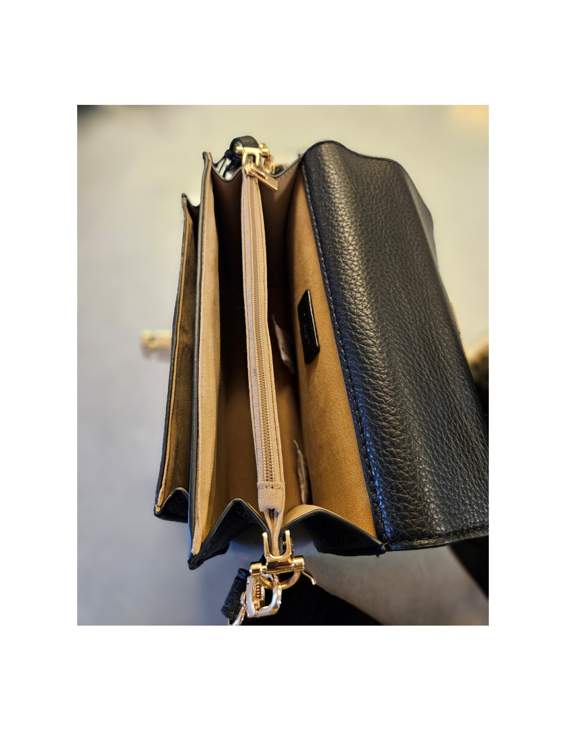 Väska i skinnimitation med flera fack varav en har dragkedja. Brett avtagbart axelband och en tillhörande nyckelring.