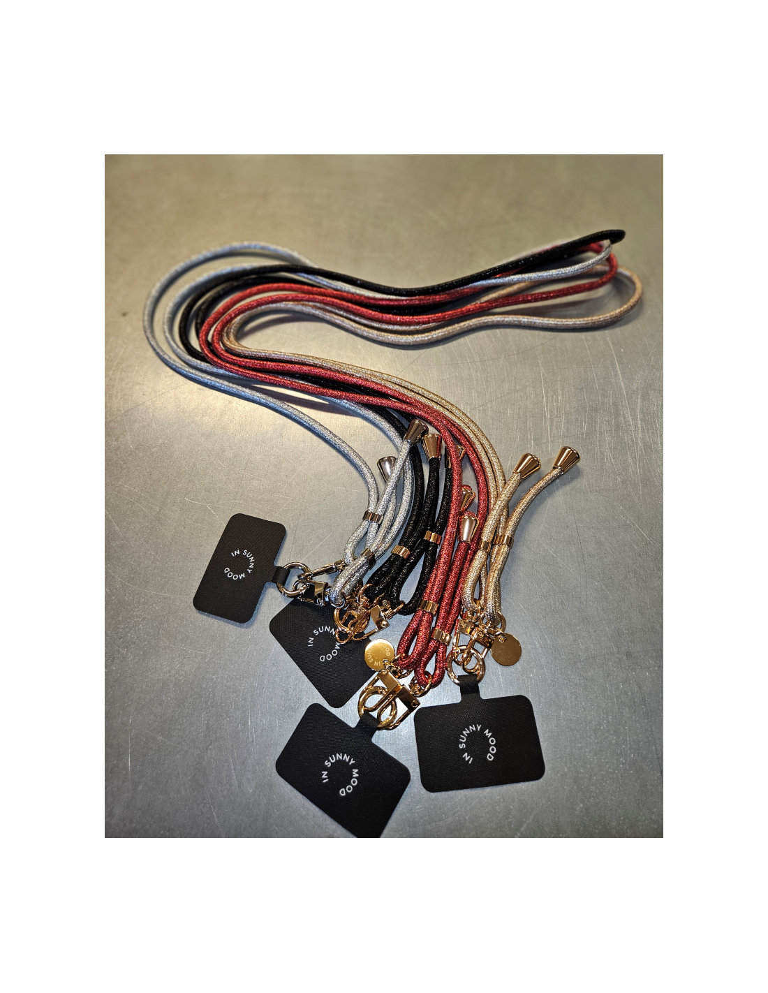 Festliga mobilsnören som är reglerbara. Sätt in den svarta lilla plattan inuti ditt mobilskal och använd den vid flera tillfällen när du inte vill ha en handväska, tex på konserter.