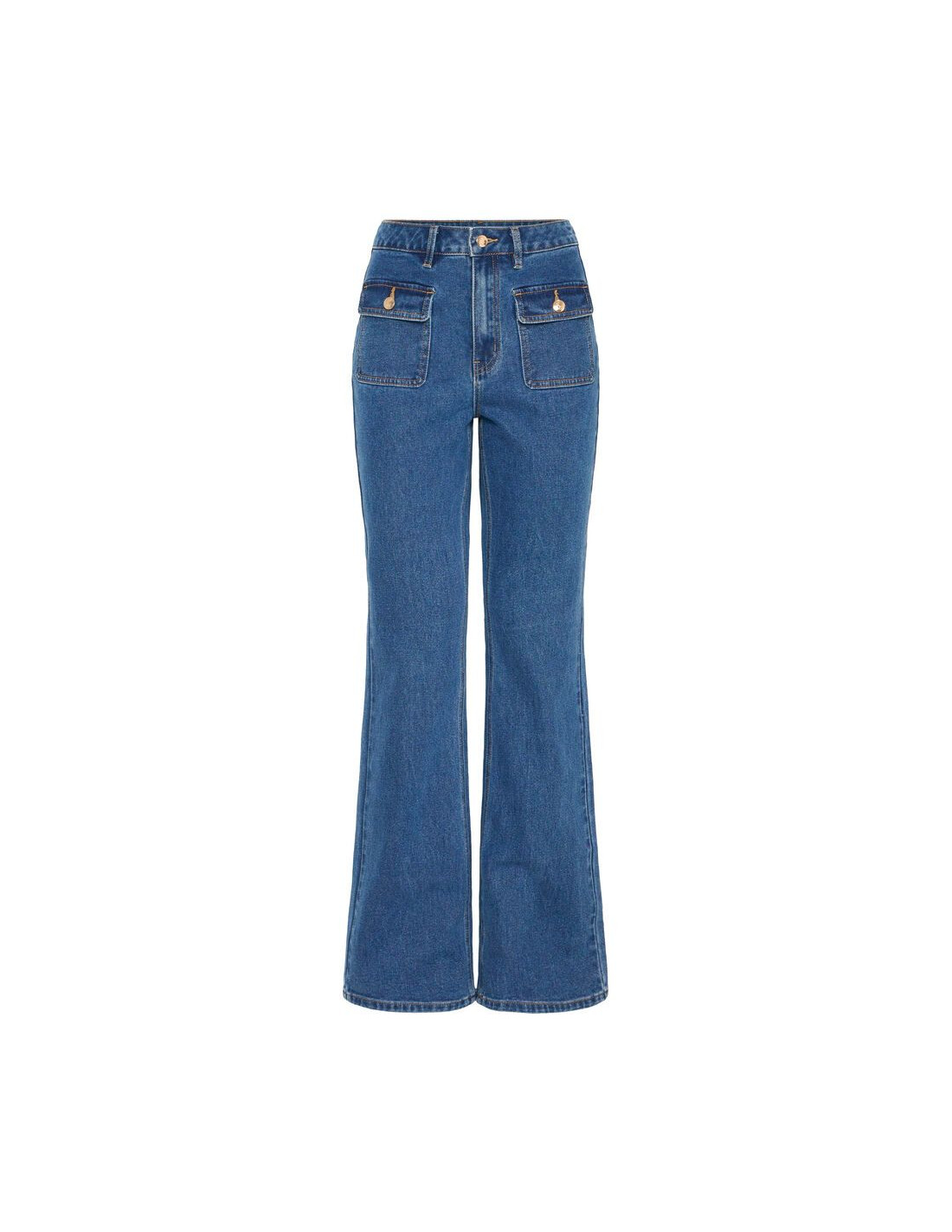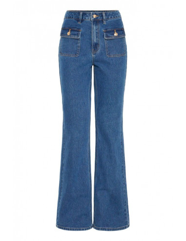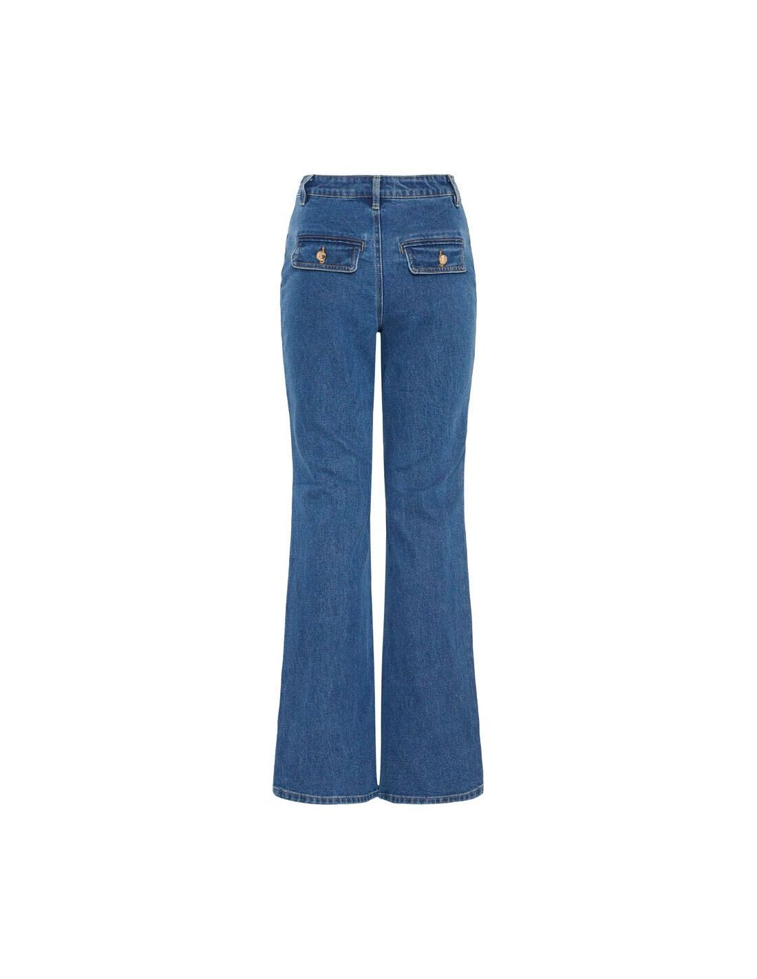 Jeans i bootcut modell. Fickor fram, och endast ficklock bak. Innerbenslängd i stl M = 81cm