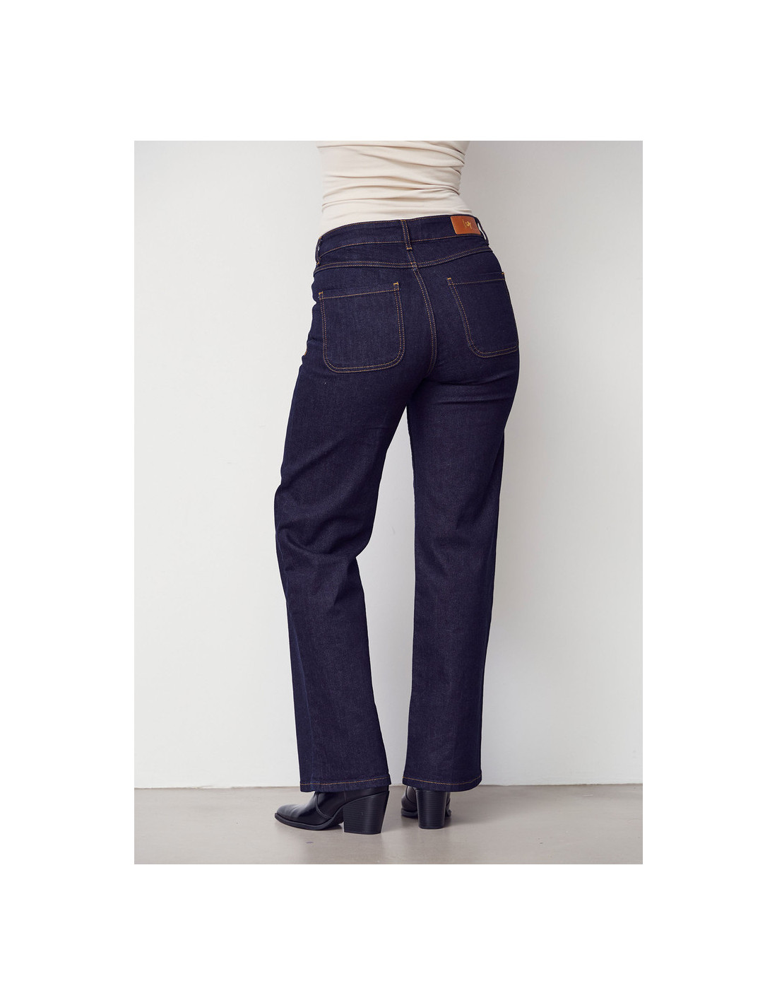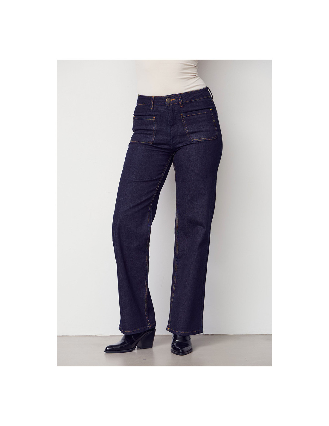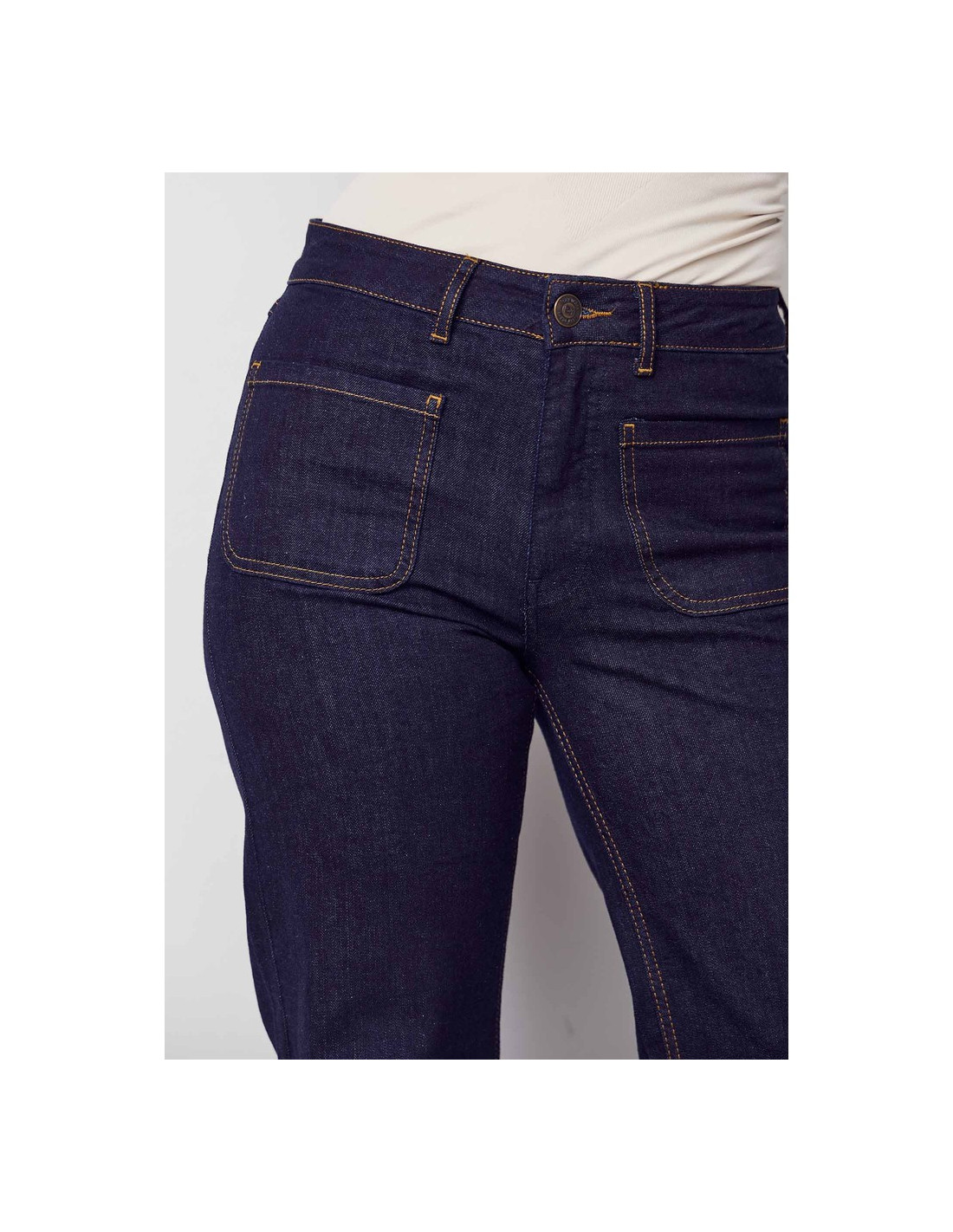 Vida jeans med markerade utanpåliggande fickor. Hög midja. Innerbenslängd 80cm