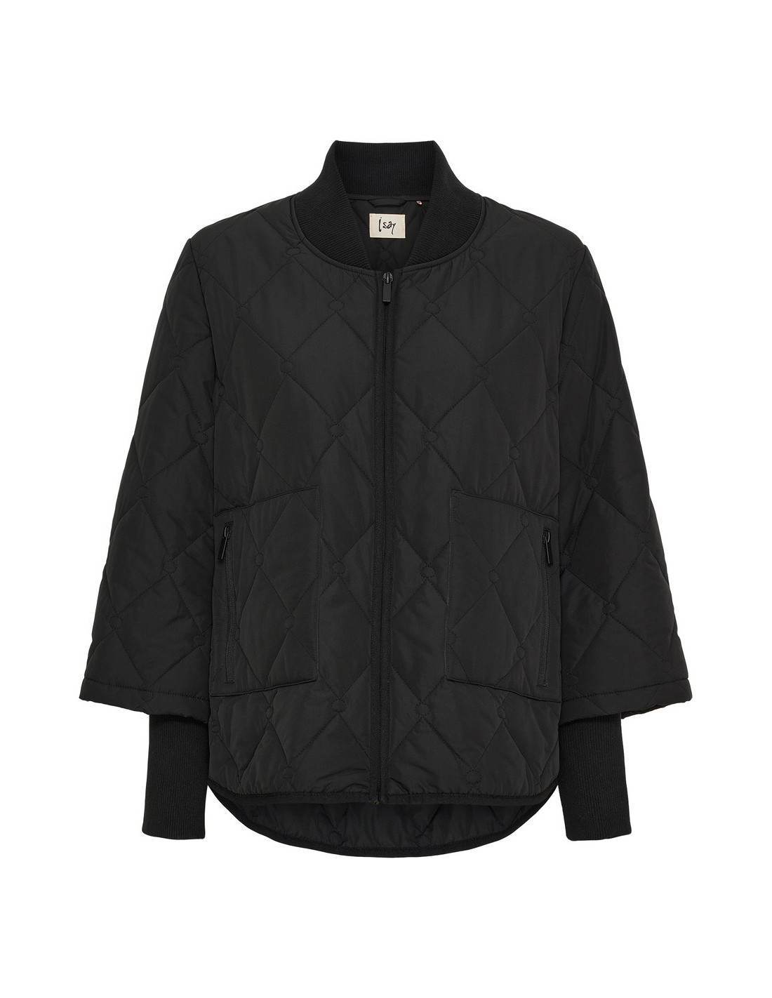 Täckjacka med dragkedja fram, två framfickor med dragkedja och vidare ärmar med mudd vid ärmslut.