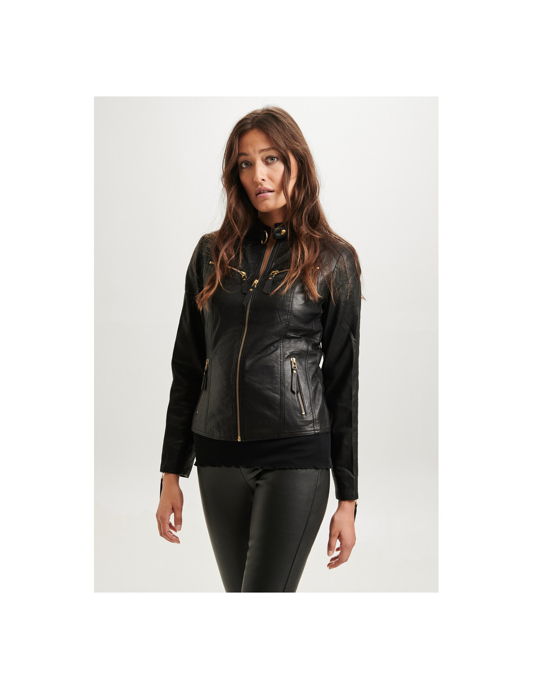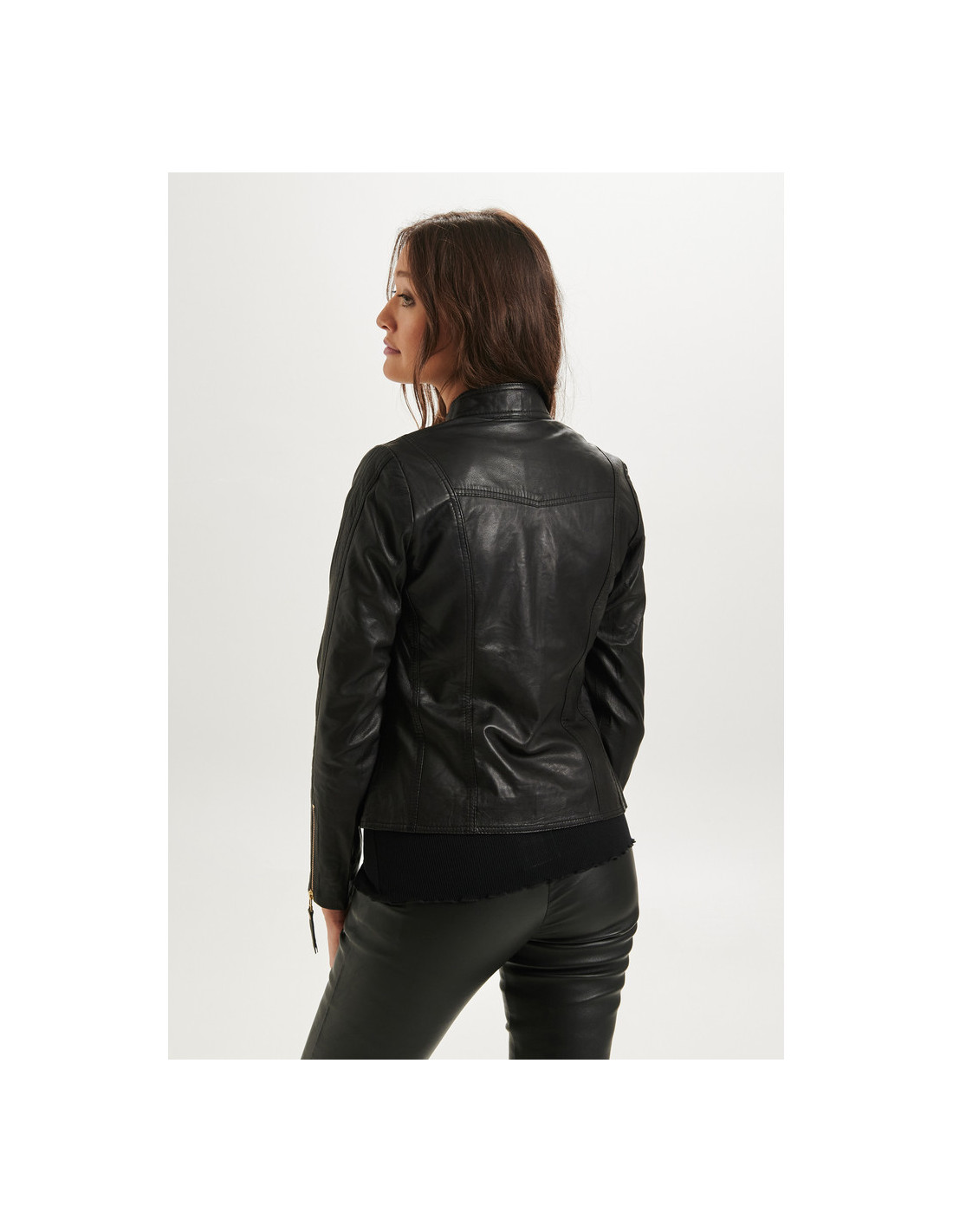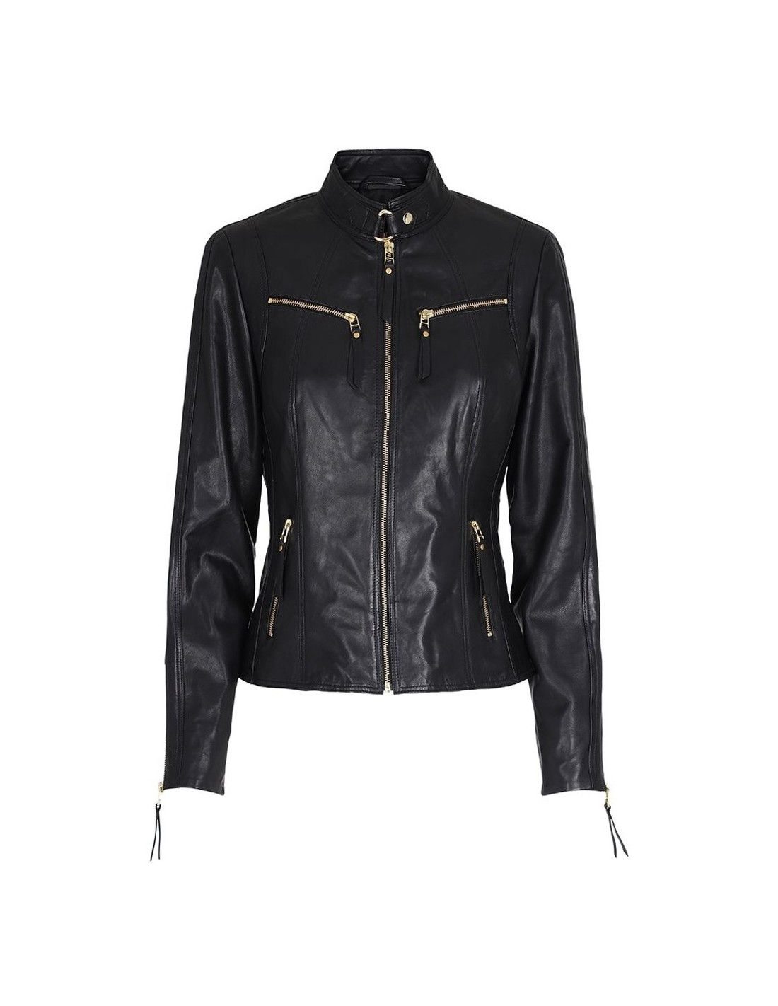 Bikerjacka i figurnära modell. Supermjukt lammskinn. Stängs med dragkedja. Liten i storlek! Rekommendras att gå upp minst en storlek.