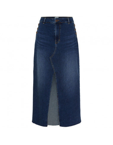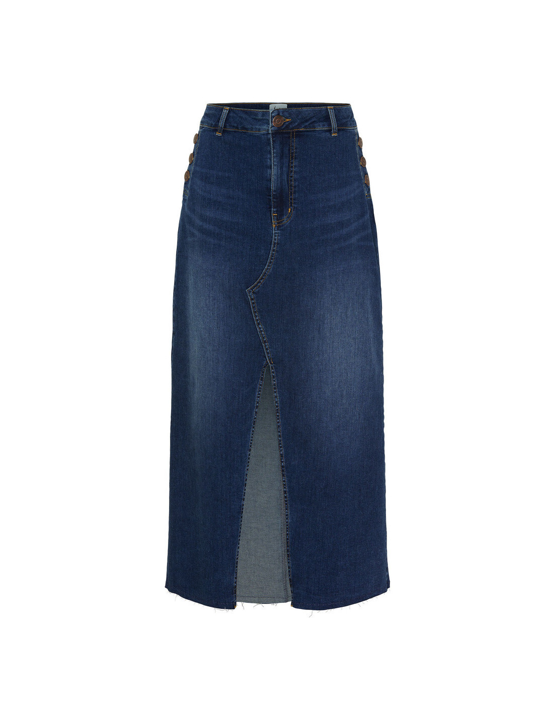 Lång jeanskjol med slits framtill och dekorativa knappar upptill
