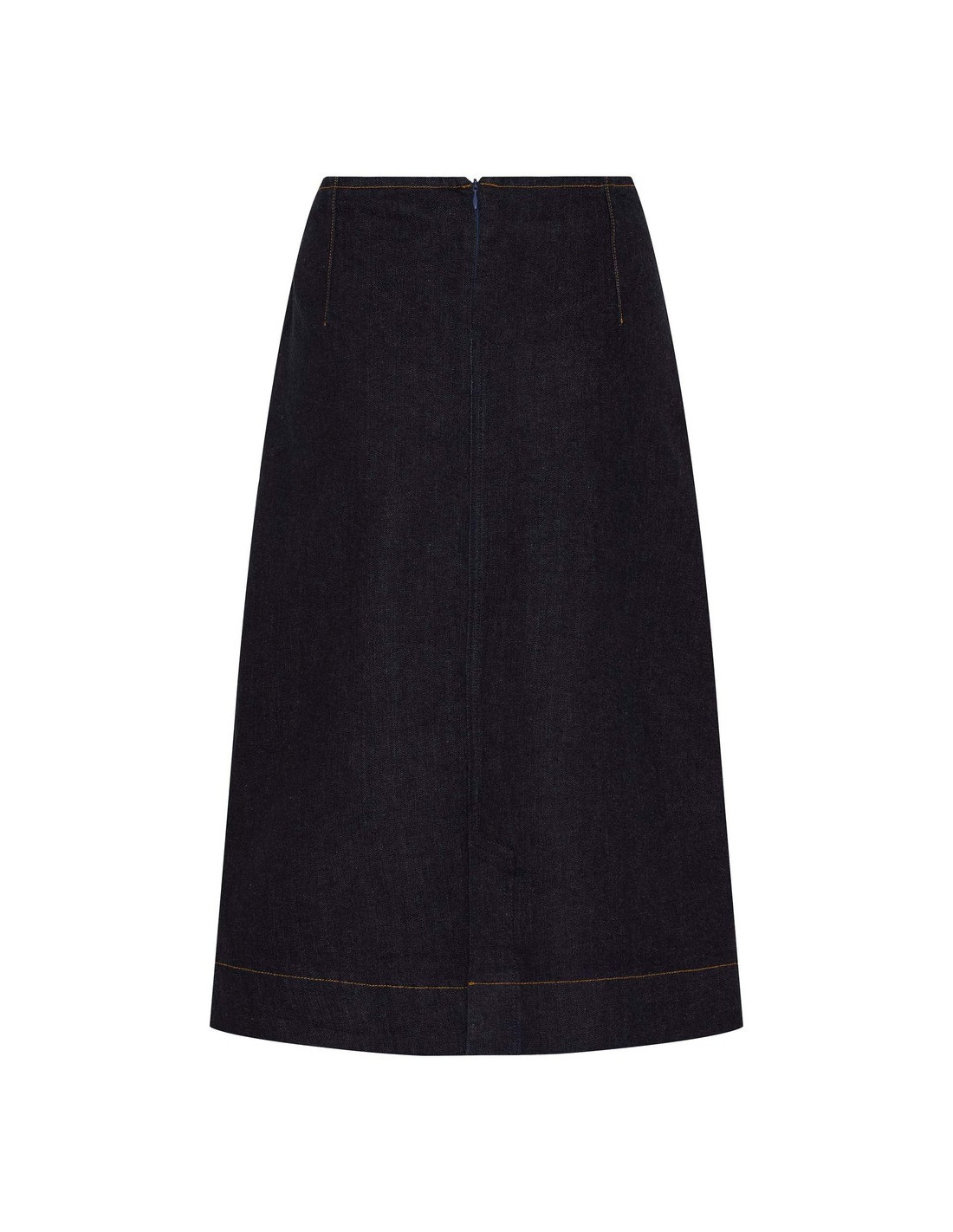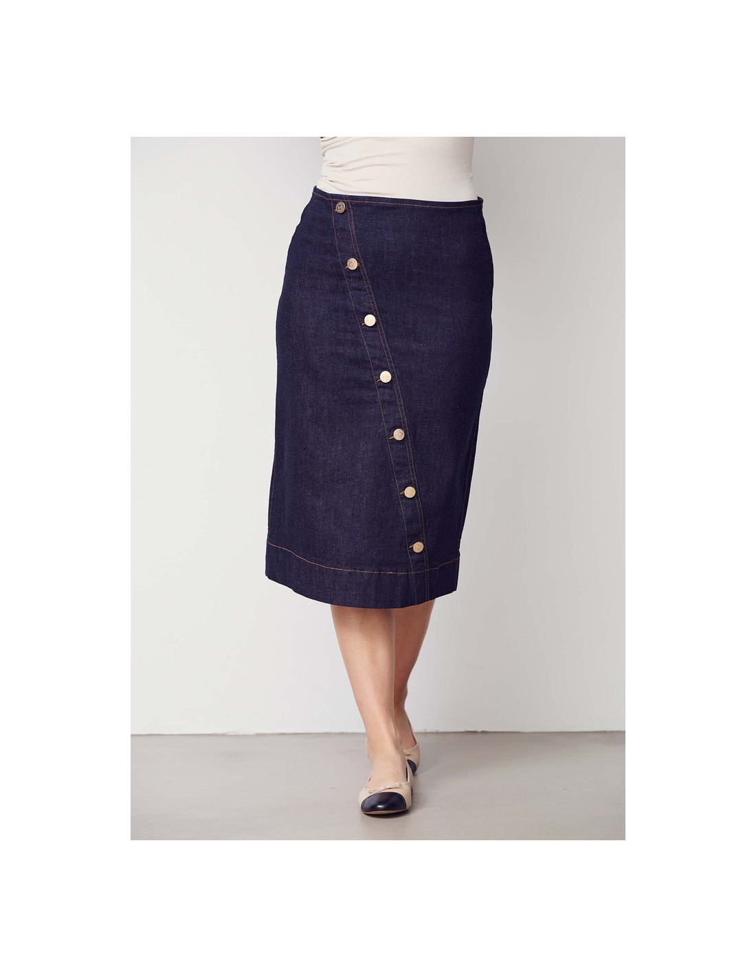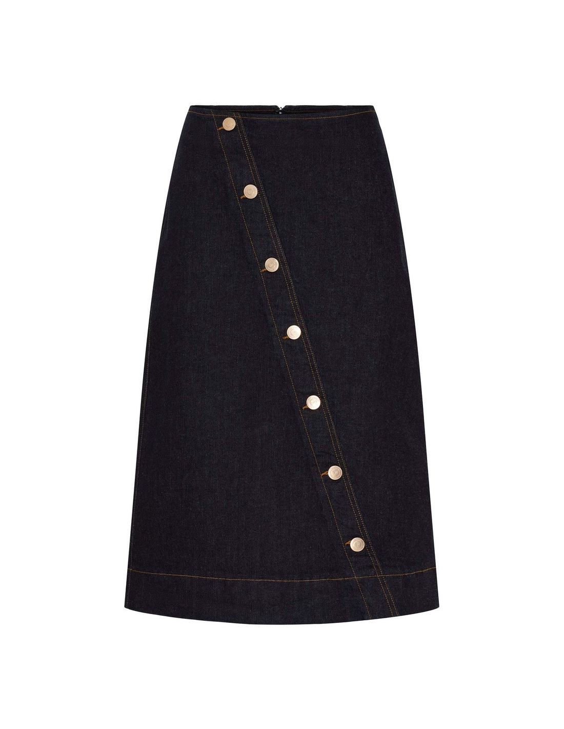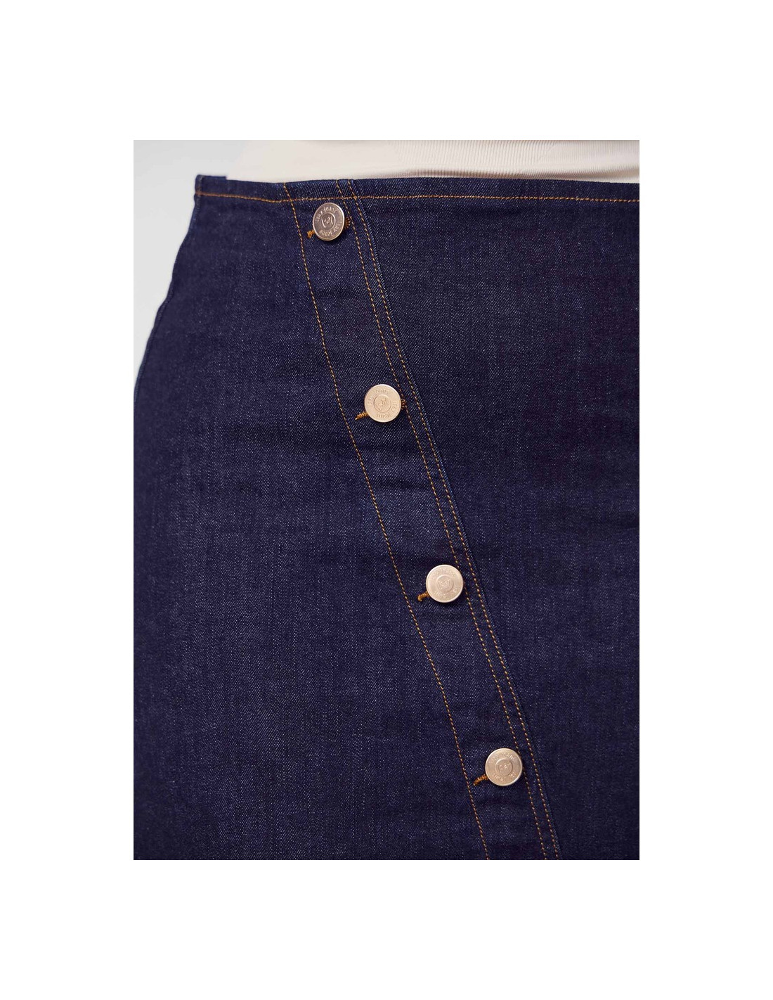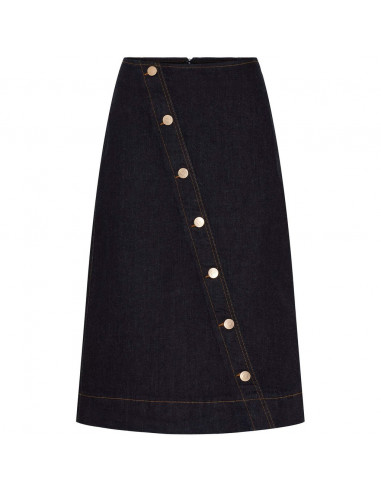 Jeanskjol i otvättad denim. Guldknappar på diagonalen som detalj. Lätt A-formad. 71cm i stl M