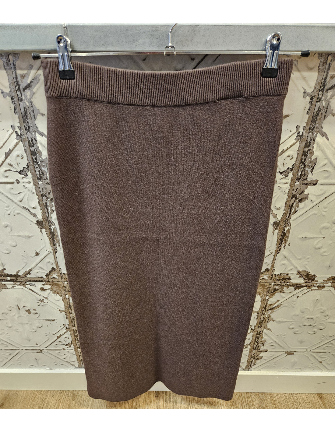 Stickad kjol med slits bak och resår i midjan. Matchande tröja i samma material och färg finns om du vill ha det som ett set.