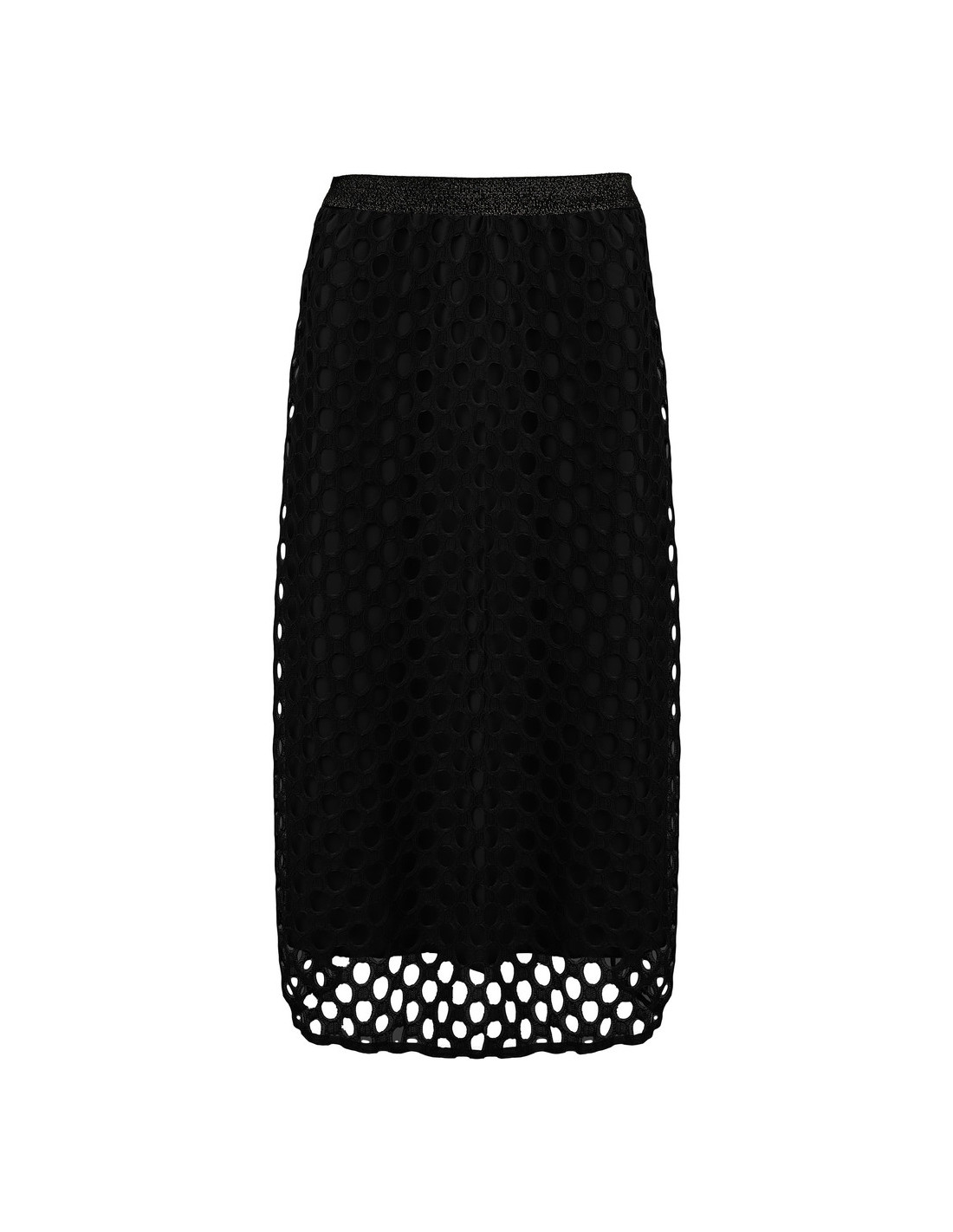 Svart kjol med glittrig resår i midjan. Fodrad med ett tunnt mönstrat tyg ovanpå.
