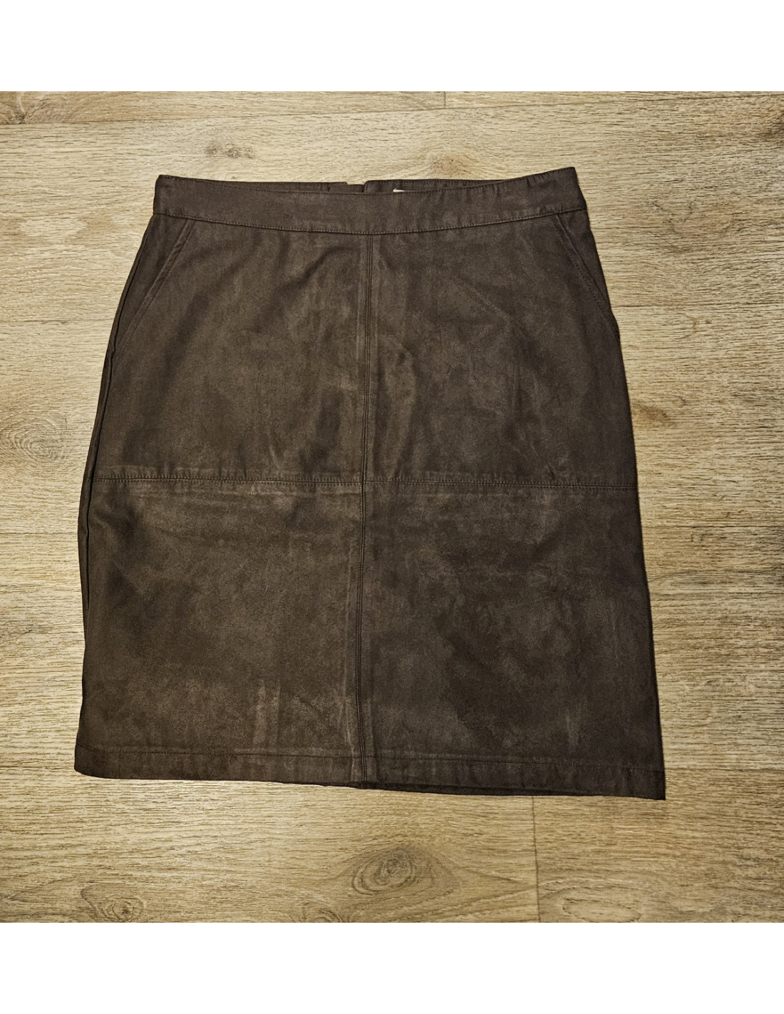 Kort kjol i fuskmocka. Dragkedja baktill och två fickor. Längd: strax ovanför knäna