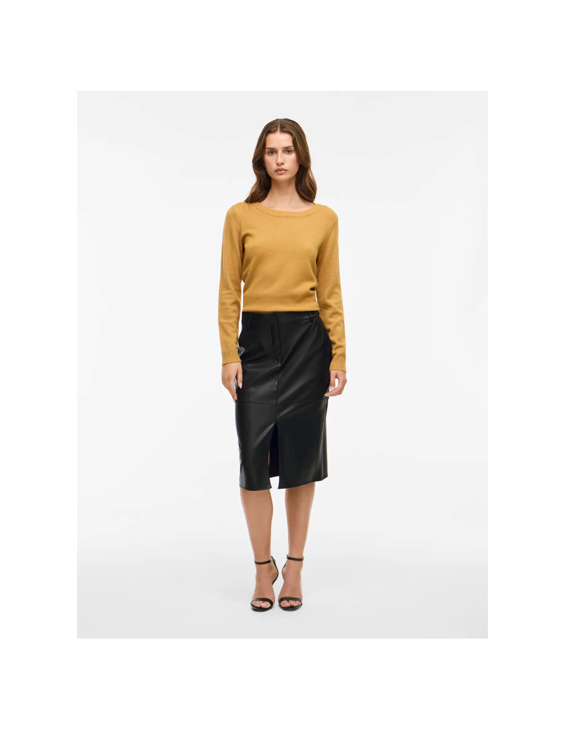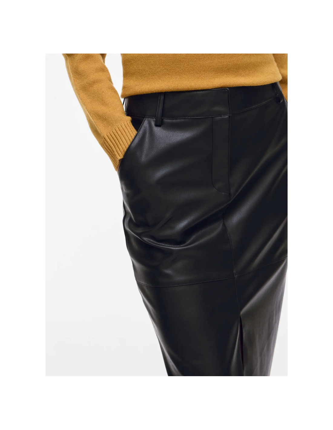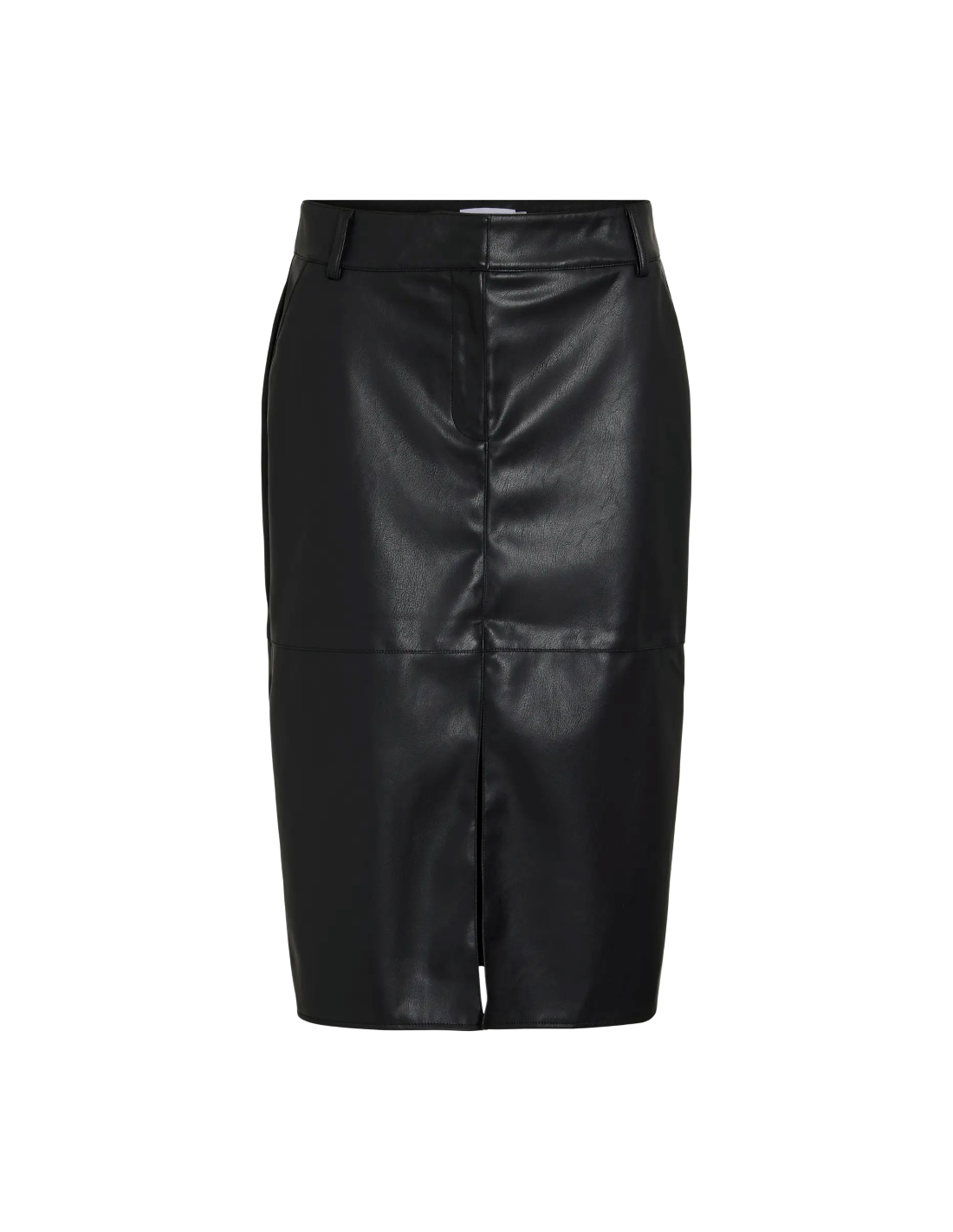 Festlig kjol i fuskskinn. Den har en linning och stängs med knapp, hyska och dragkedja framtill. Två sidofickor och sprund framtill. Längd: strax under knäna