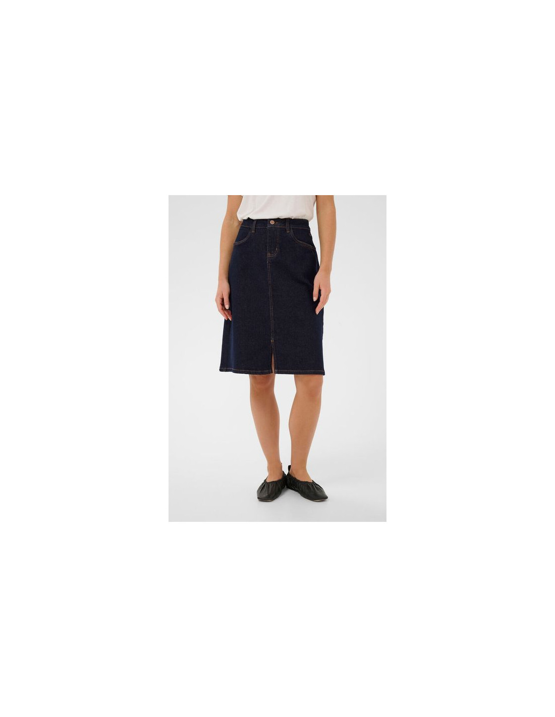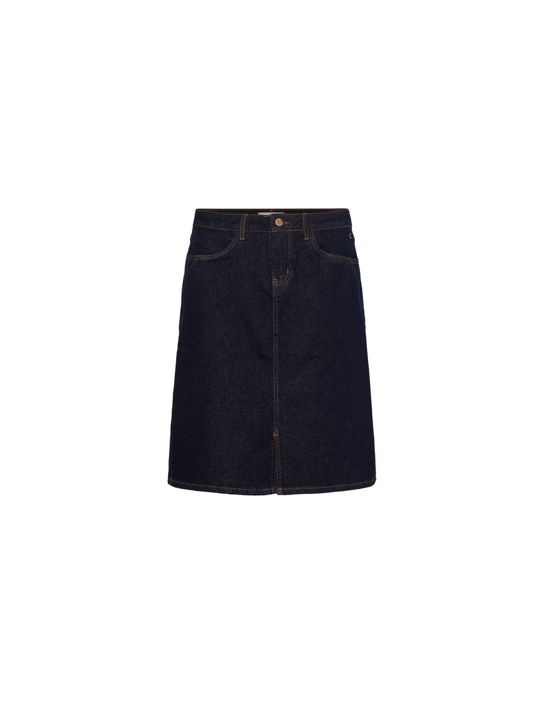 Knälång jeanskjol i A-form. Dragkedja och knapp fram och två sidofickor fram samt två baktill