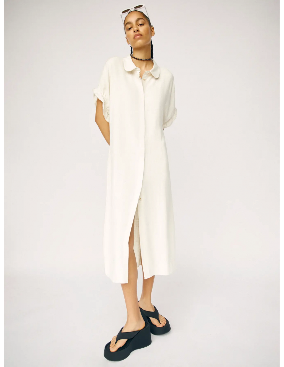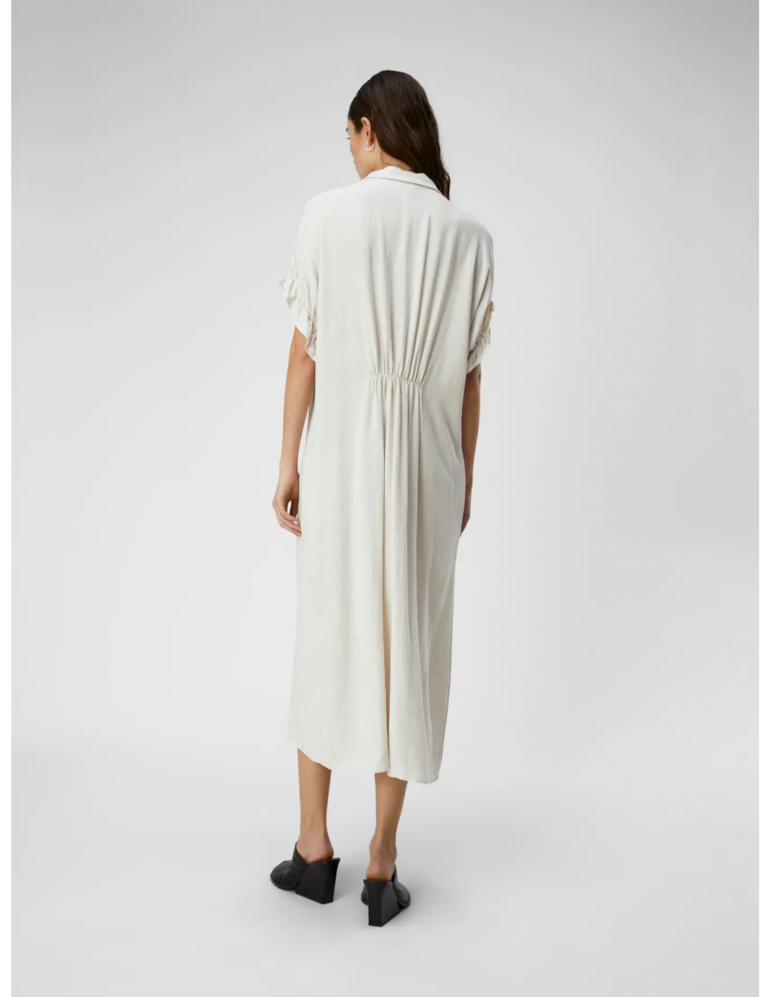 Längre linneklänning med klassisk krage, kort ärm med rynkdetalj, dolda knappar fram, fickor och rynkdetalj i ryggen. Något rymlig i storlek.