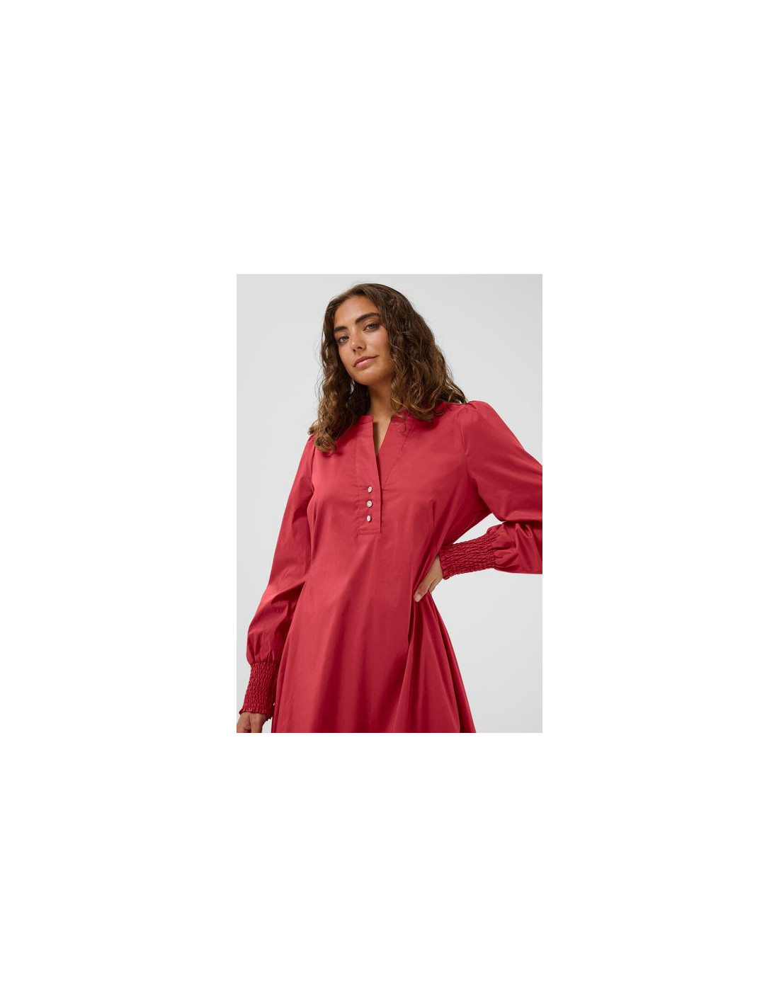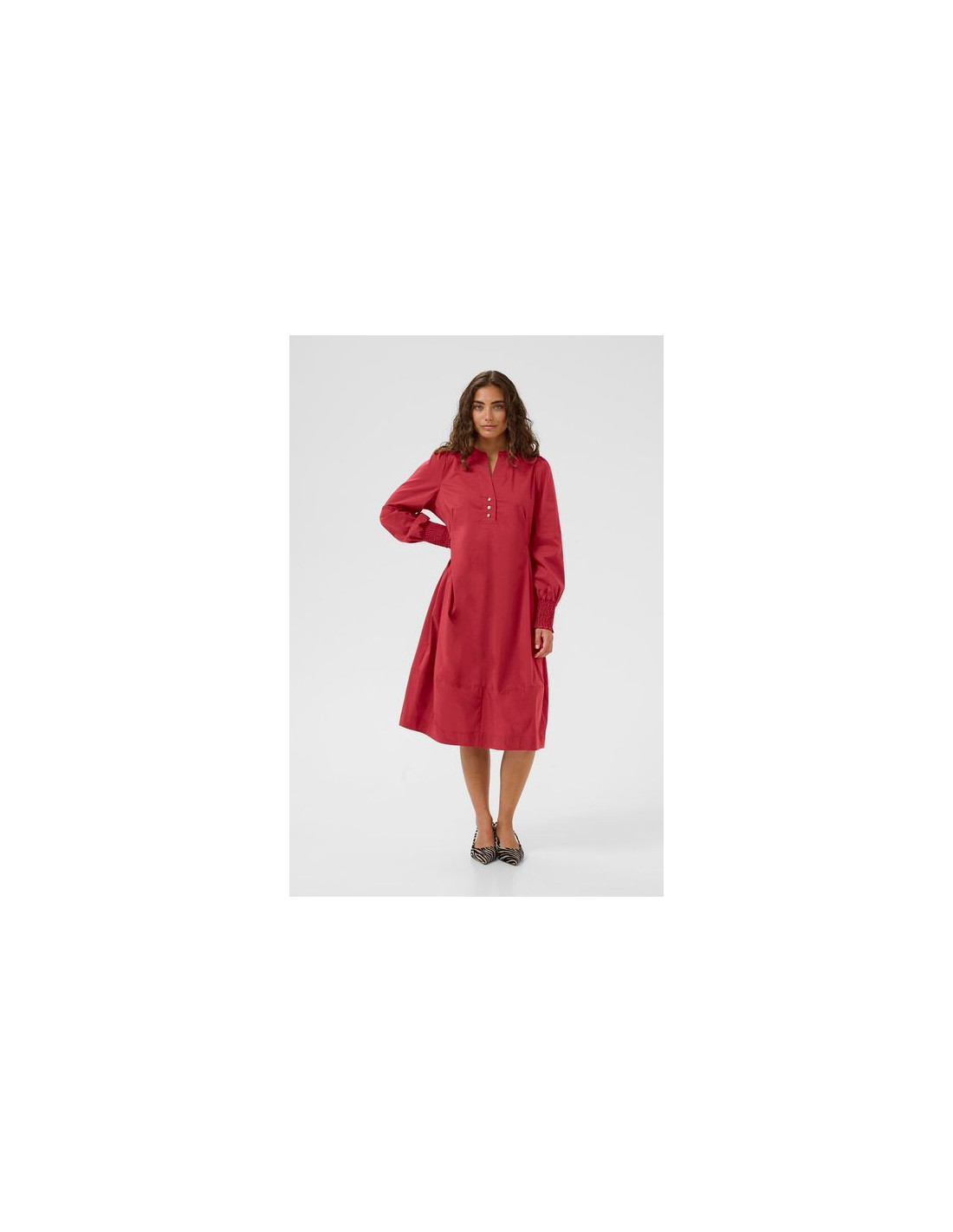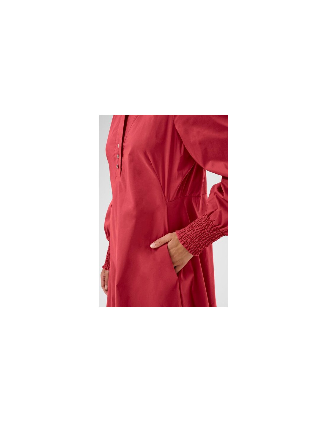 Härlig klänning från Culture i bomullspoplin. Fina utsmyckade knappar framtill. Långa ärmar med smock nertill. Sidofickor.