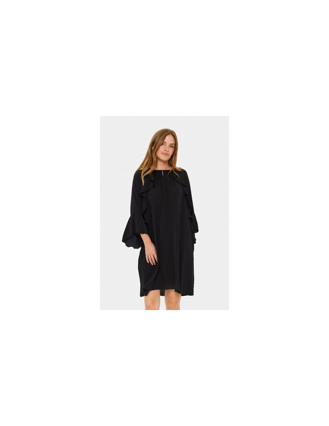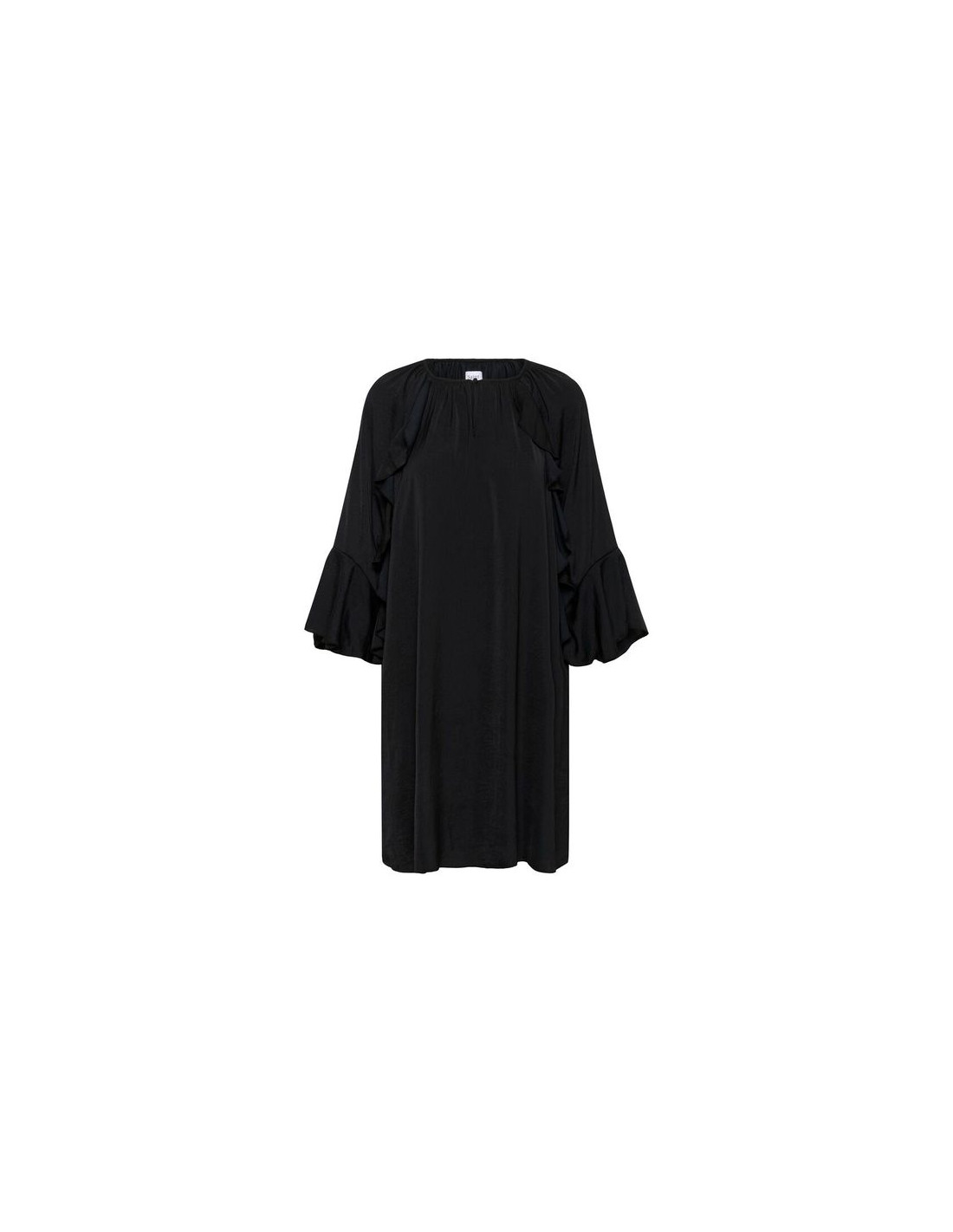 Rundhalsad klänning med volanger. A-formad och längd strax ovanför knäna. 3/4 armlängd