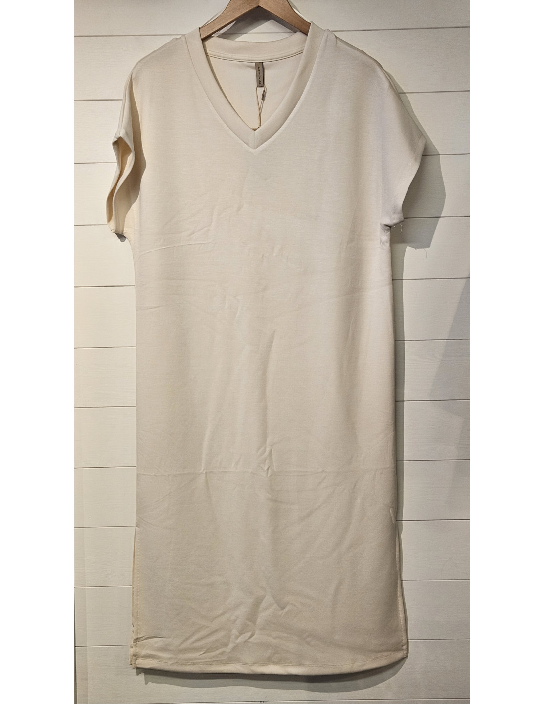 V-ringad klänning i skön och mjuk kvalité i rak modell med slits nertill och korta ärmar. Vadlång