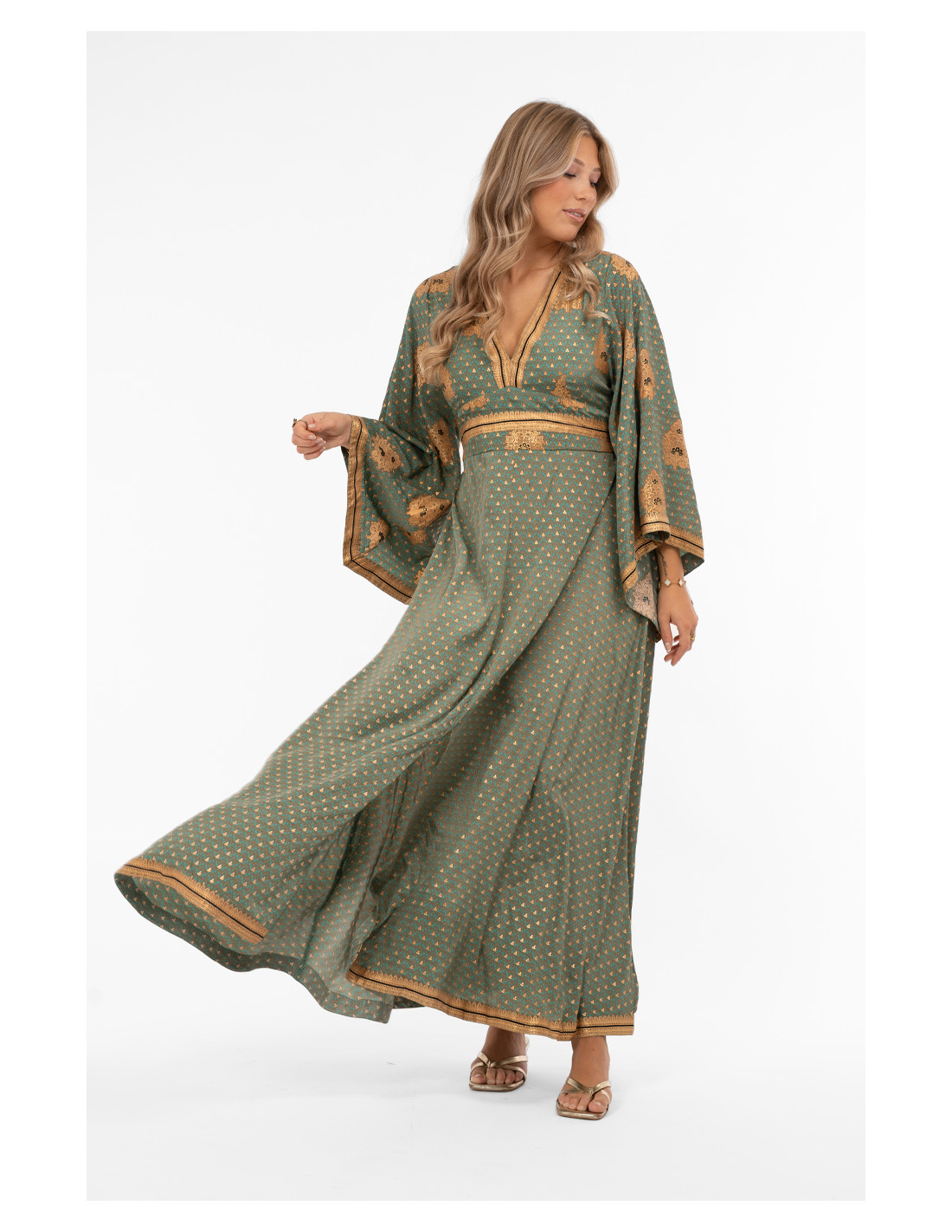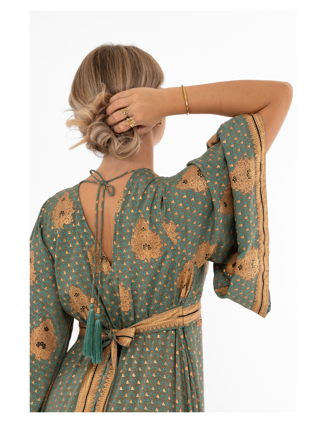 Ayla Klänning – sommarklänning i turkost och guld med v-ringning fram och bak, justerbart knytband och slits. Feminin och bohemisk stil för alla tillfällen.