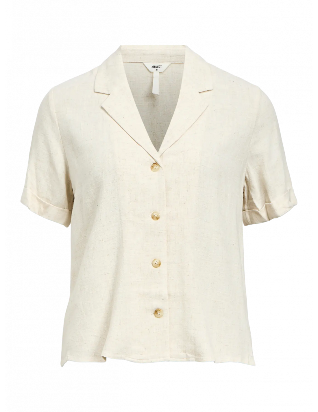 Kortärmad linneskjorta med krage och knappar fram. Något lös passform