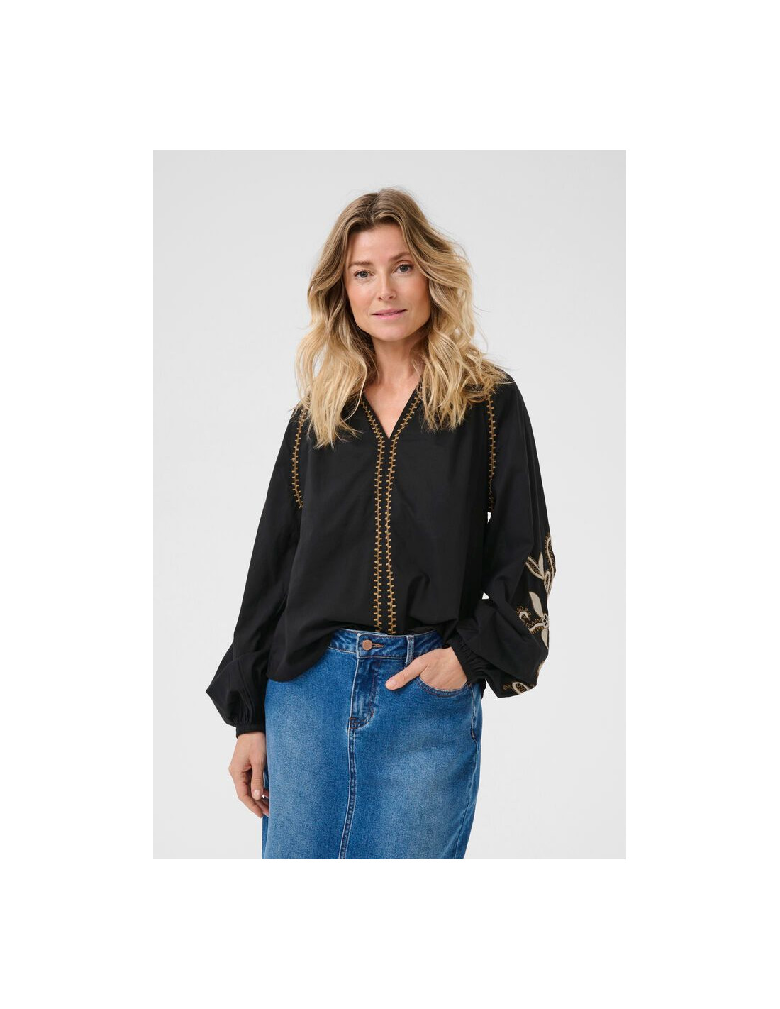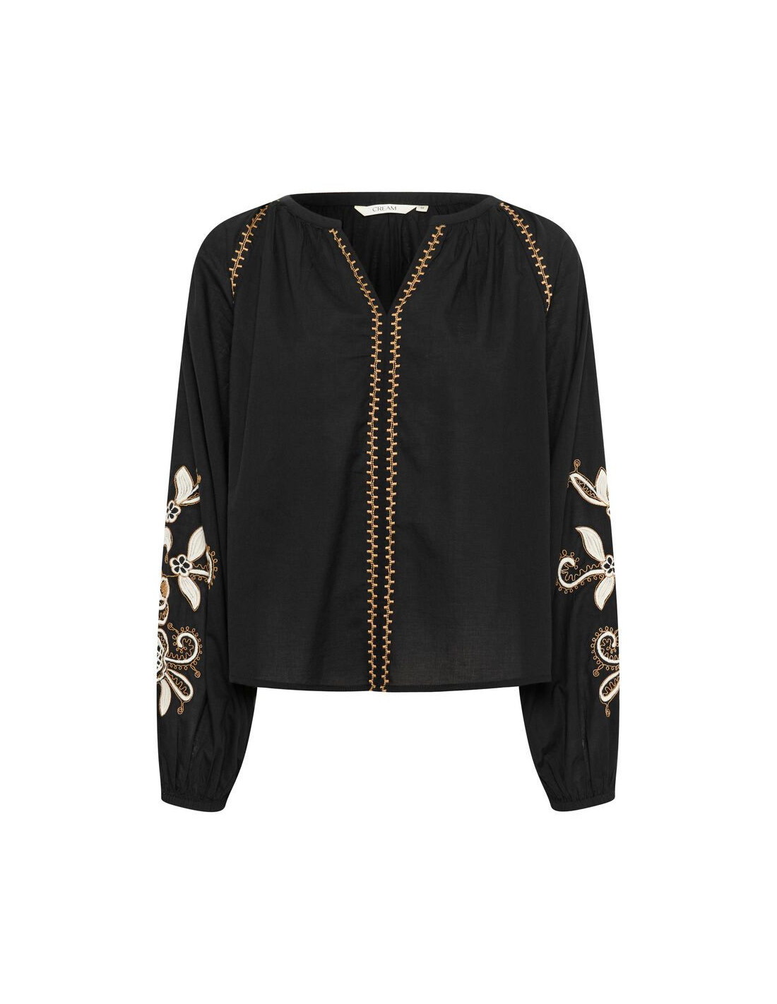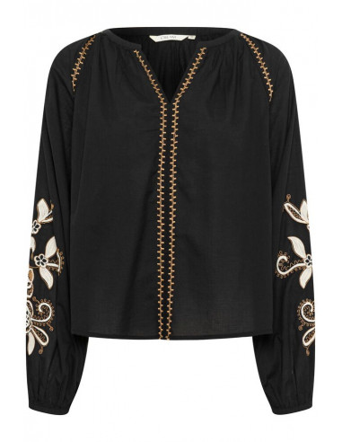 Bomullsblus i boho stil med fina broderier på ärmen. Svart botten med broderier i brunt och cremevitt.