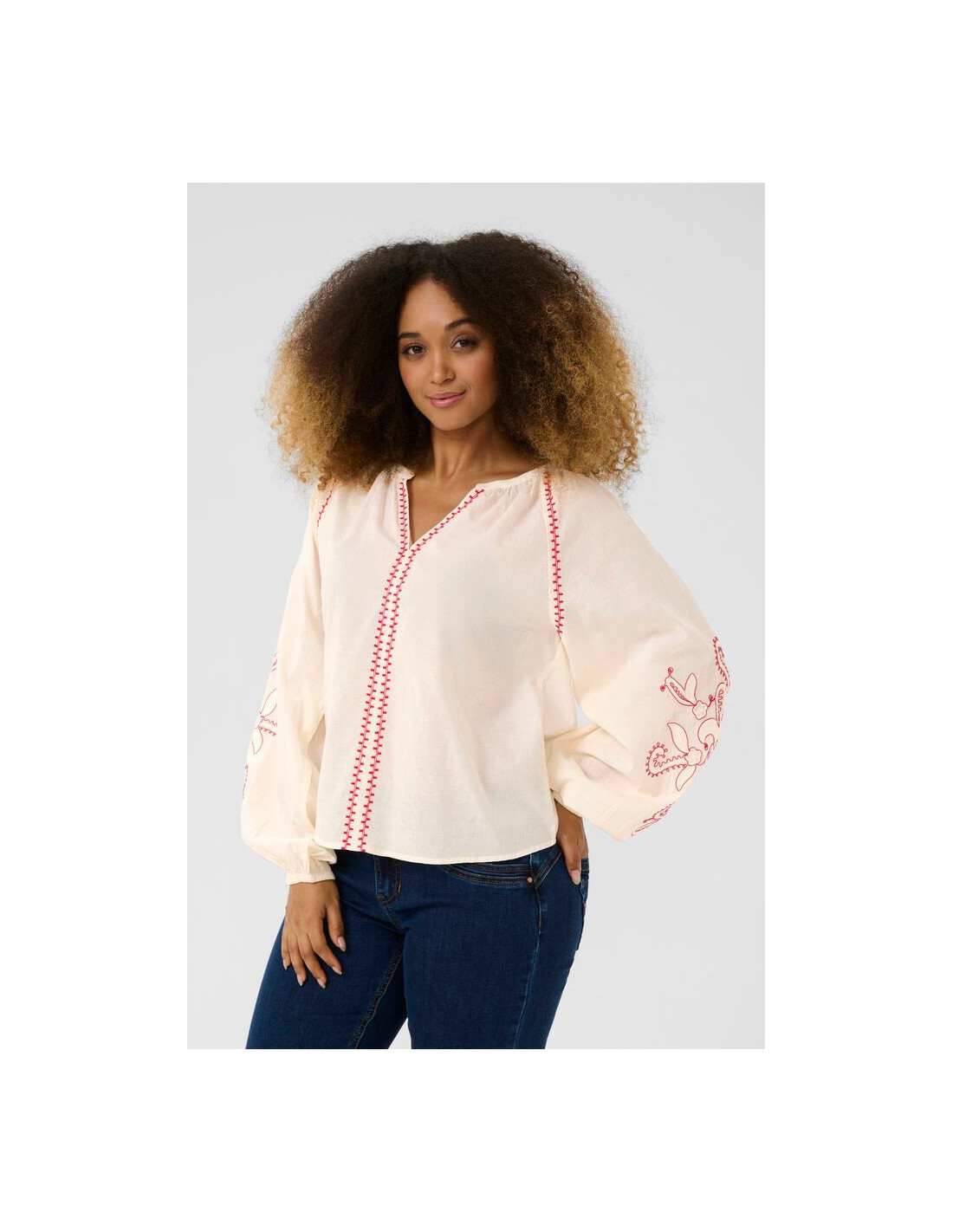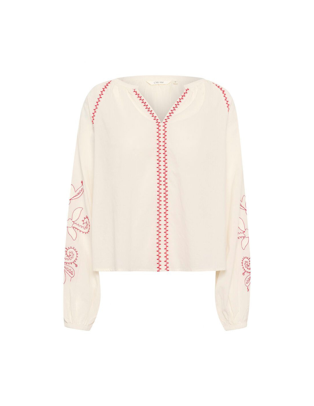 Bomullsblus i boho stil med fina broderier på ärmen. Cremevit botten med broderier i rött