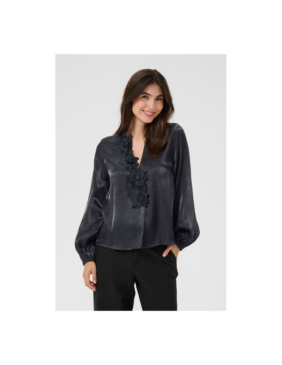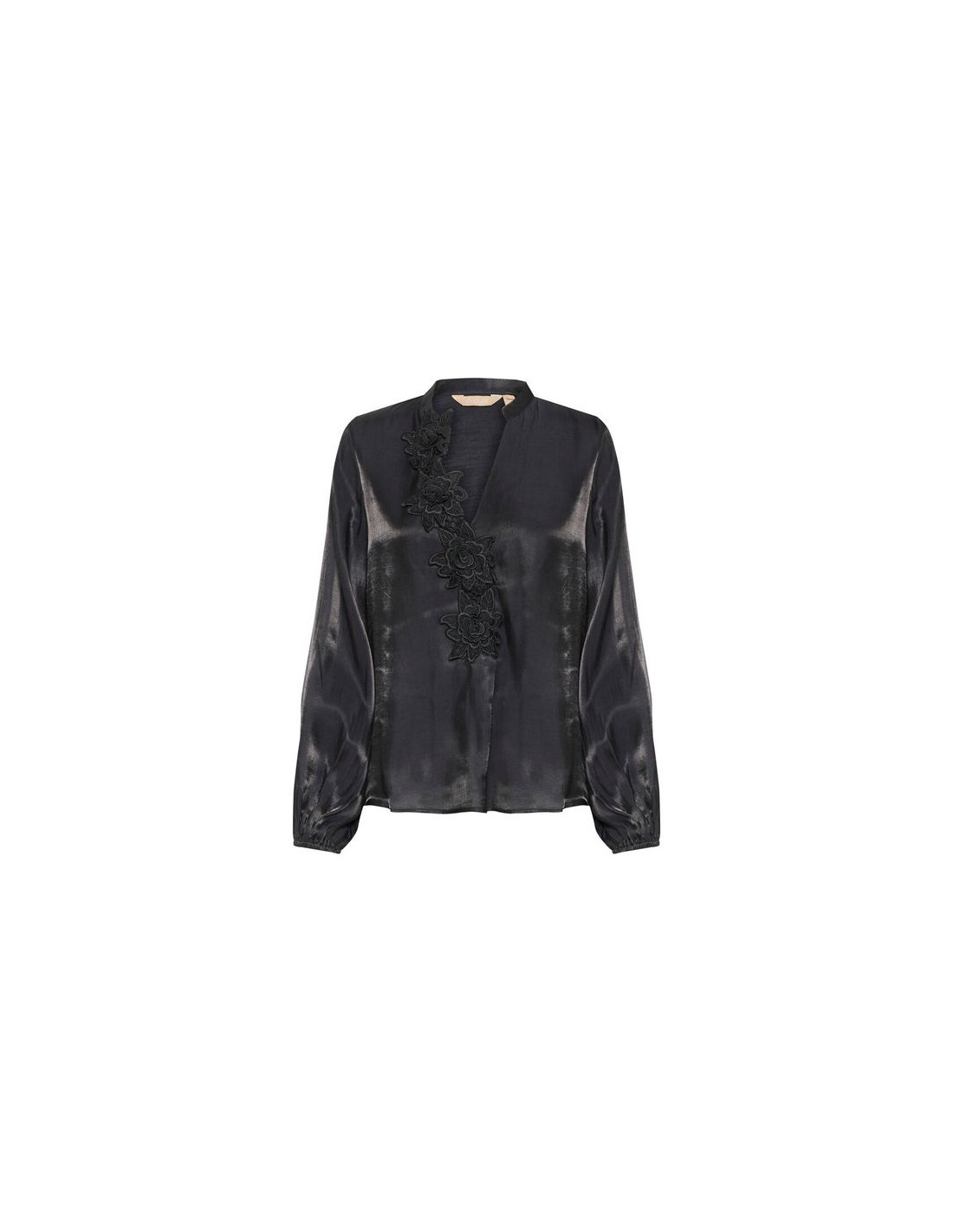 Läcker viscosetop med fina blomdekorationer framtill. Blank viscose ger en lyxig känsla, lika fin till fest som vardag. Resår vid ärmslut.