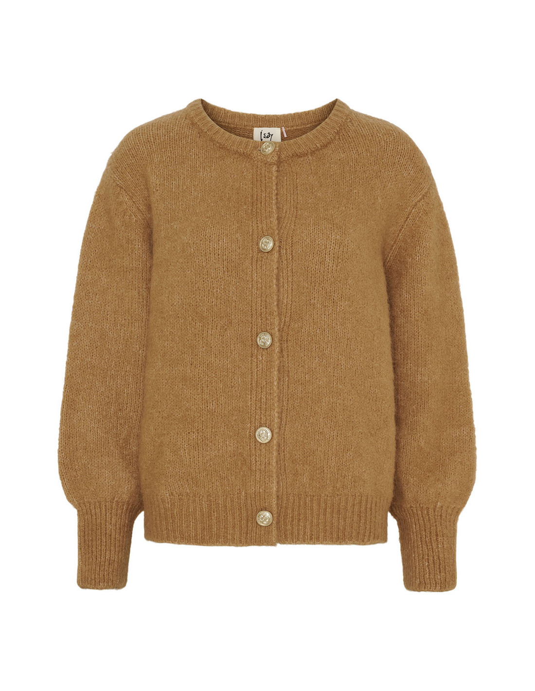 Rundhalsad kofta med fina dekorativa knappar och fluffigt garn.
