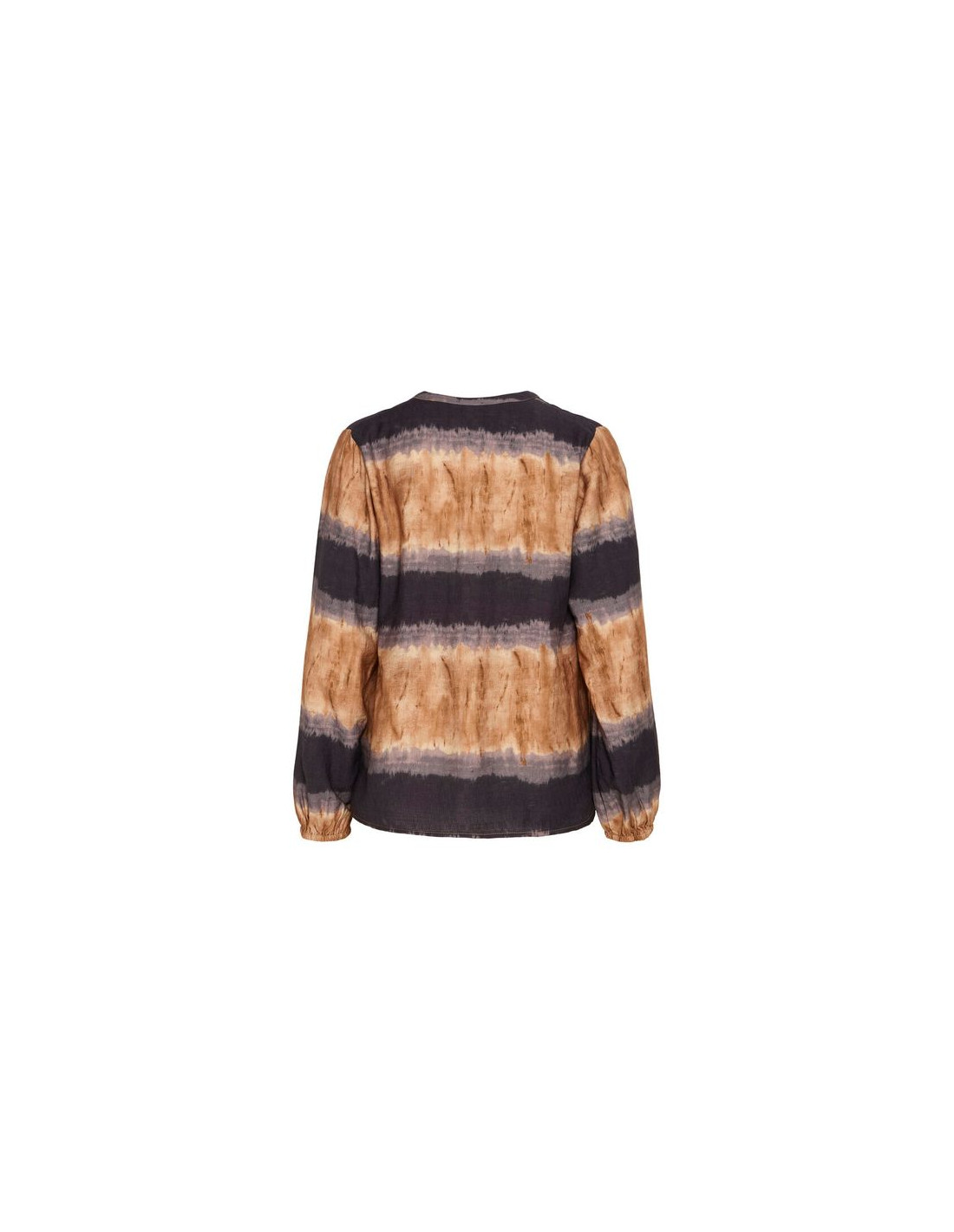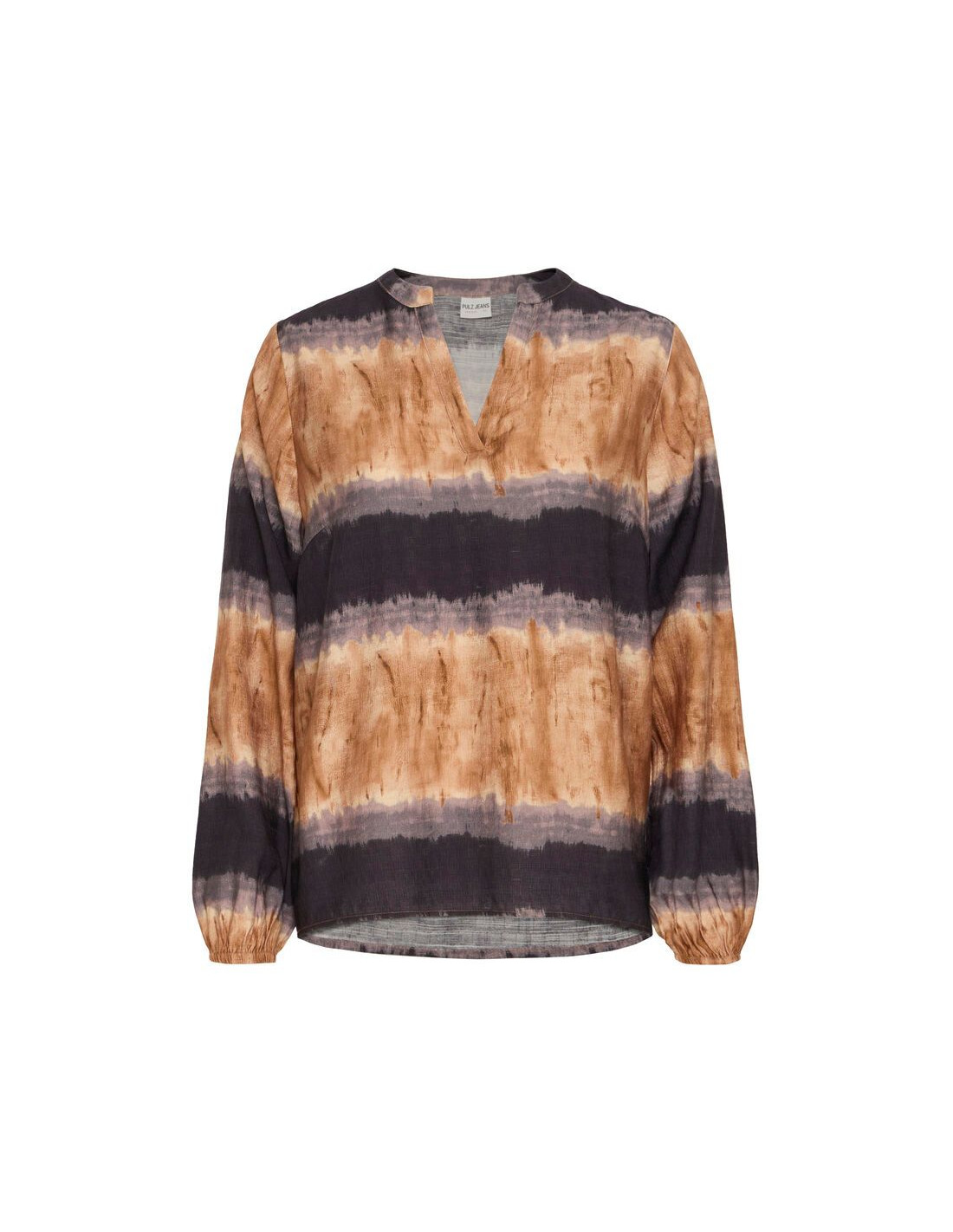 Viscoseblus med fint print i mörkblå och bruna toner. Lös passform. Lång ärm med resår vid ärmslut