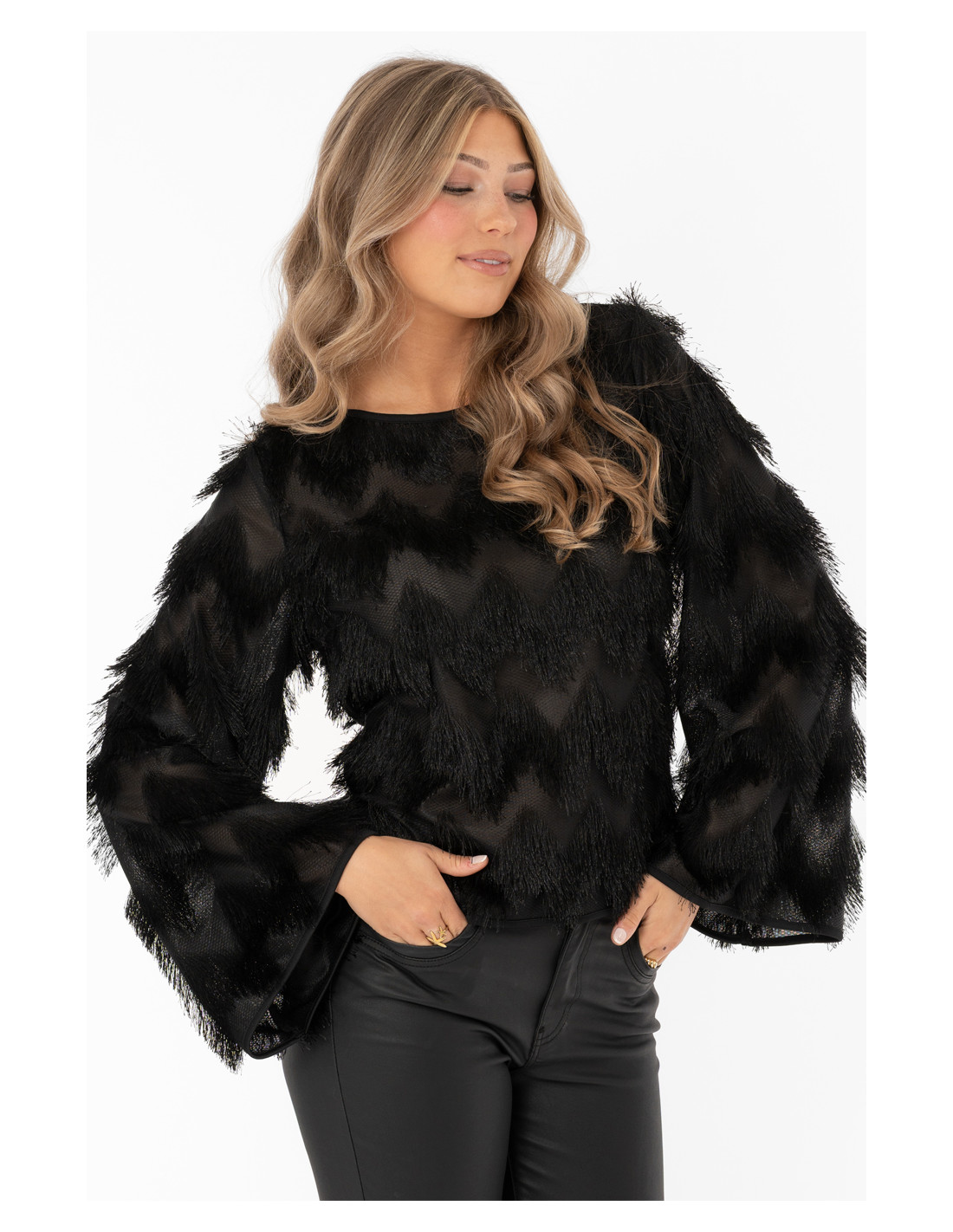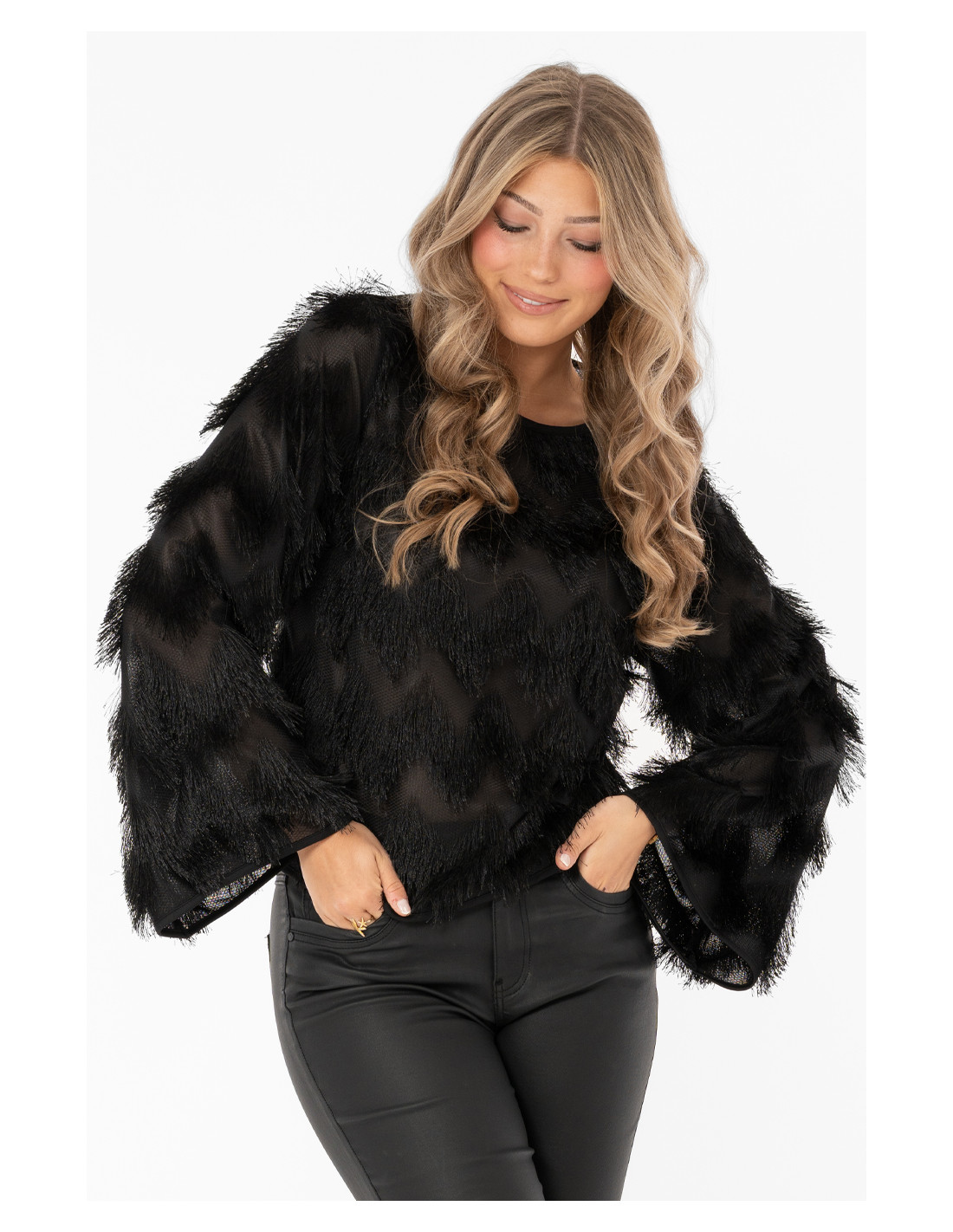Trendig tröja med fransar i zickzack mönster. Ledig passform med lätt utställda ärmar i fullängd.