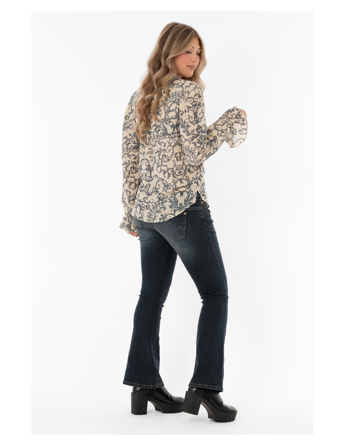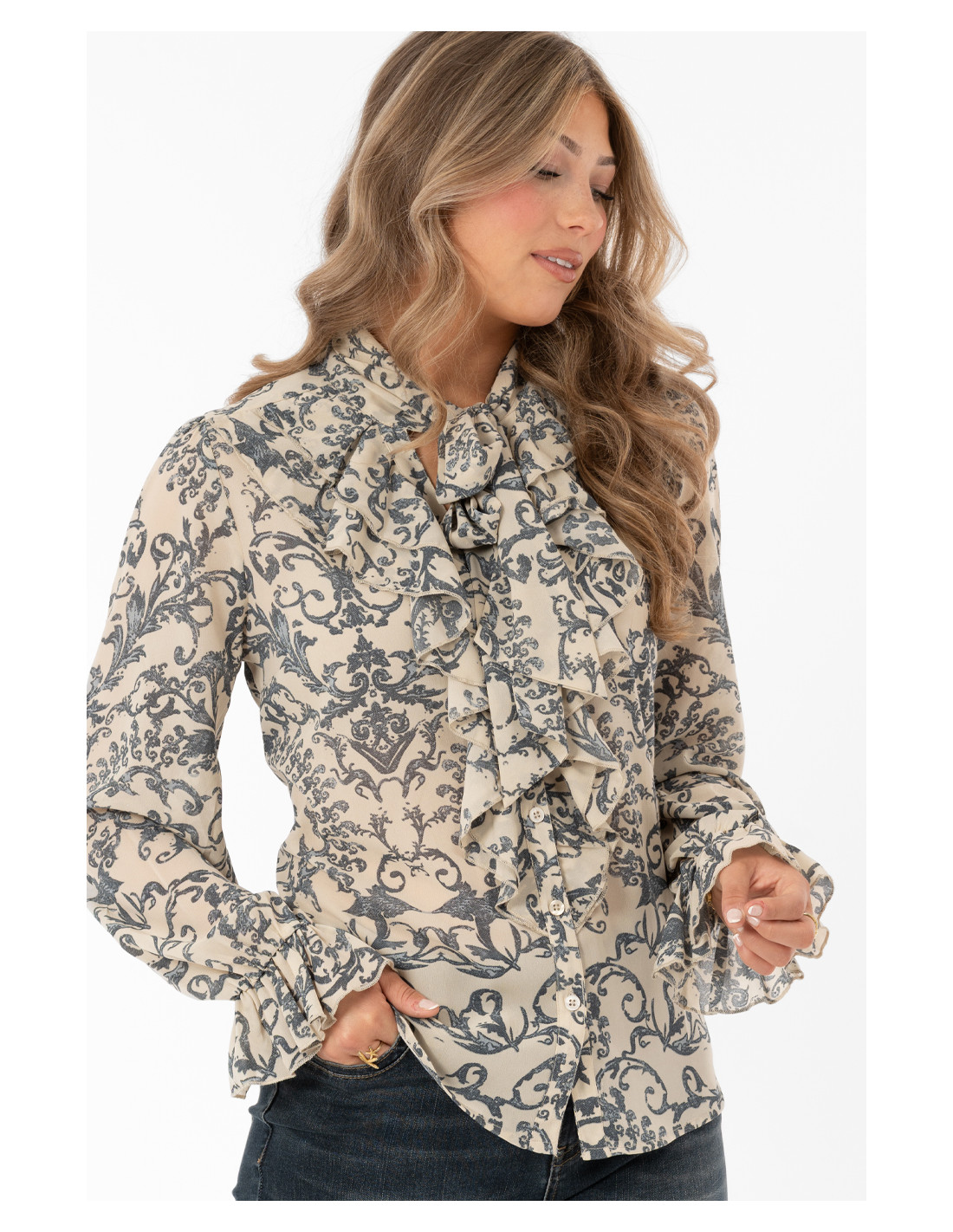 Vacker blus med ett paisleymönster i ljuvliga blå toner, perfekt för en snygg höstoutfit med jeans! Blusen är gjord i en tunn georgettekvalité som ger ett fint fall. Blusen har en v-ringad halsöppning med dubbla lager volang runt urringningen samt knytband i halsen. Knappar framtill. Ärmarna på blusen är hellånga och har en volang med resår vid handleden. Små sprund i sidorna och lätt rundad nederkant.