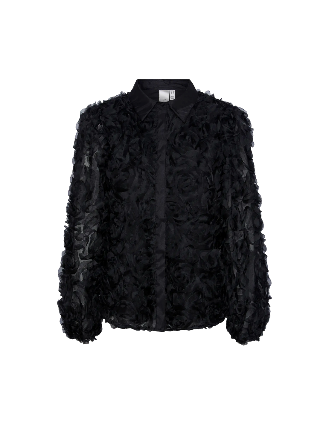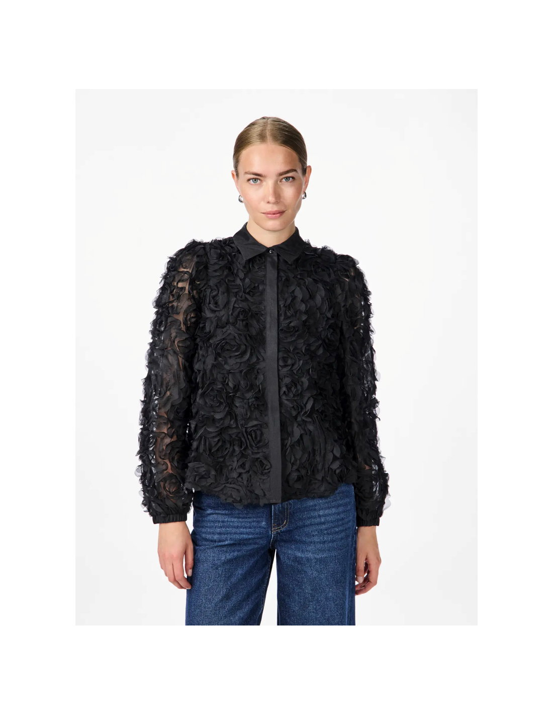 Långärmad blus med rosor. Klassisk krage och dold knäppning.