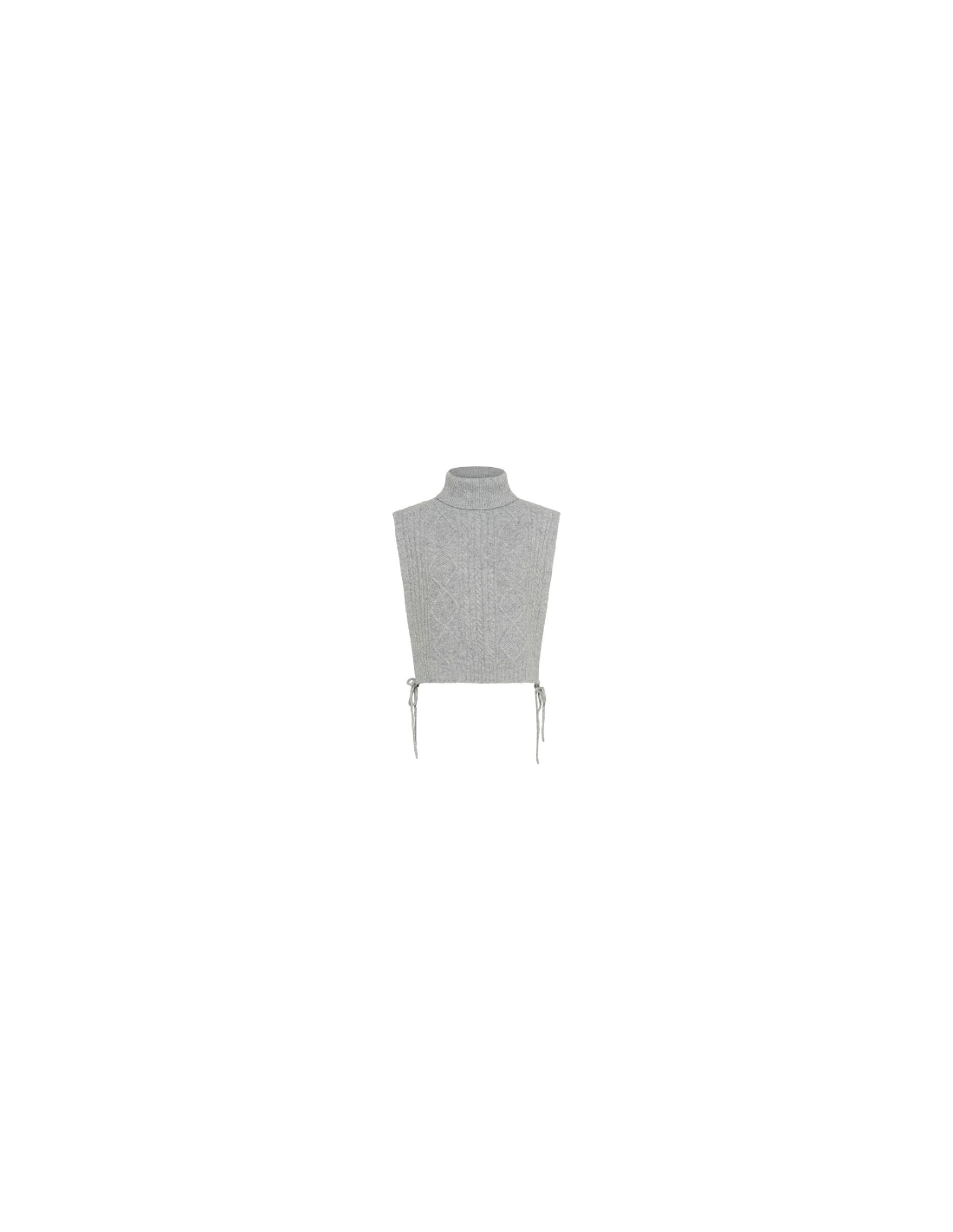 Stickad väst med polokrage. Öppen i sidan, men kan knytas nertill. Flätmönstrad på framsidan, slät på ryggen