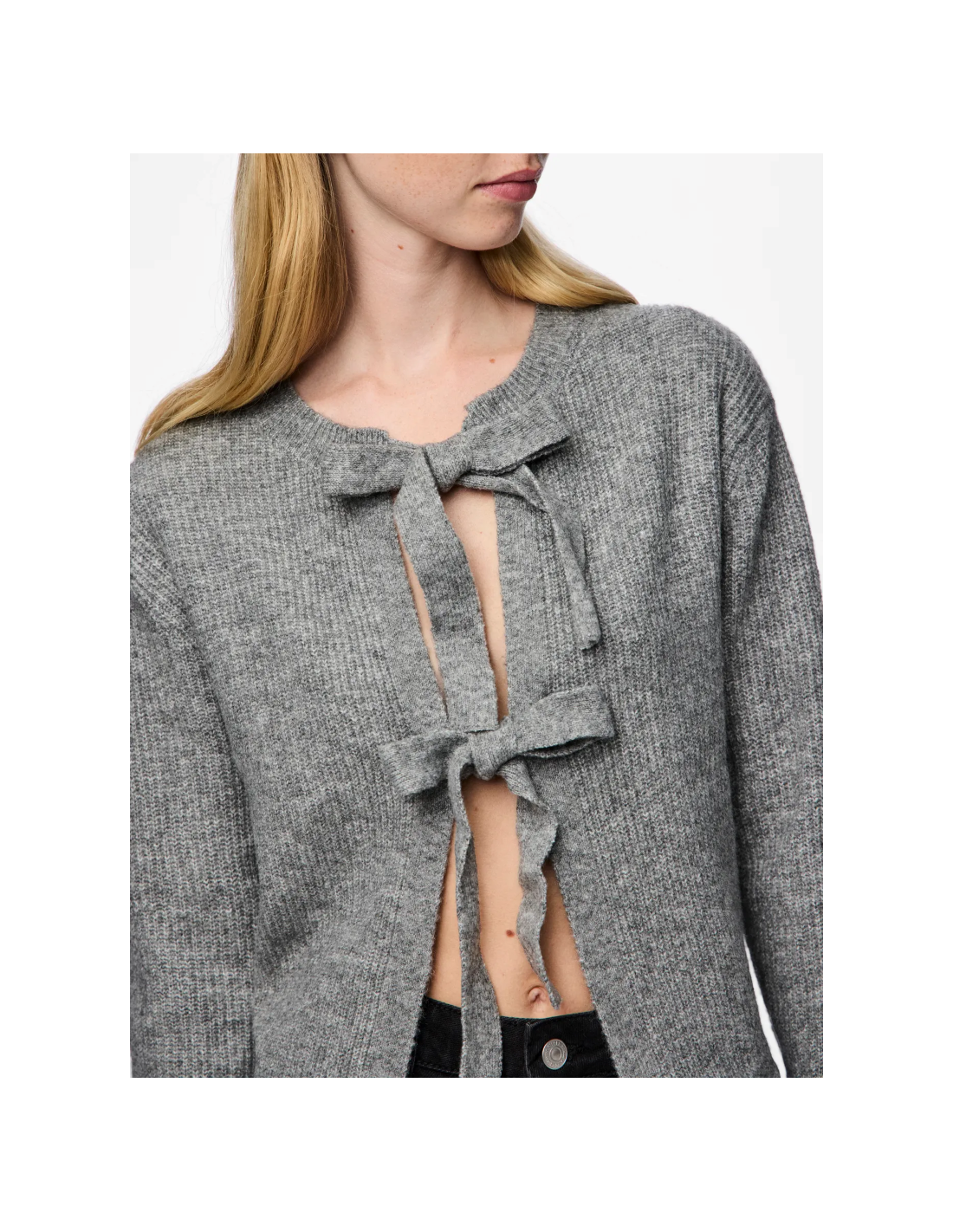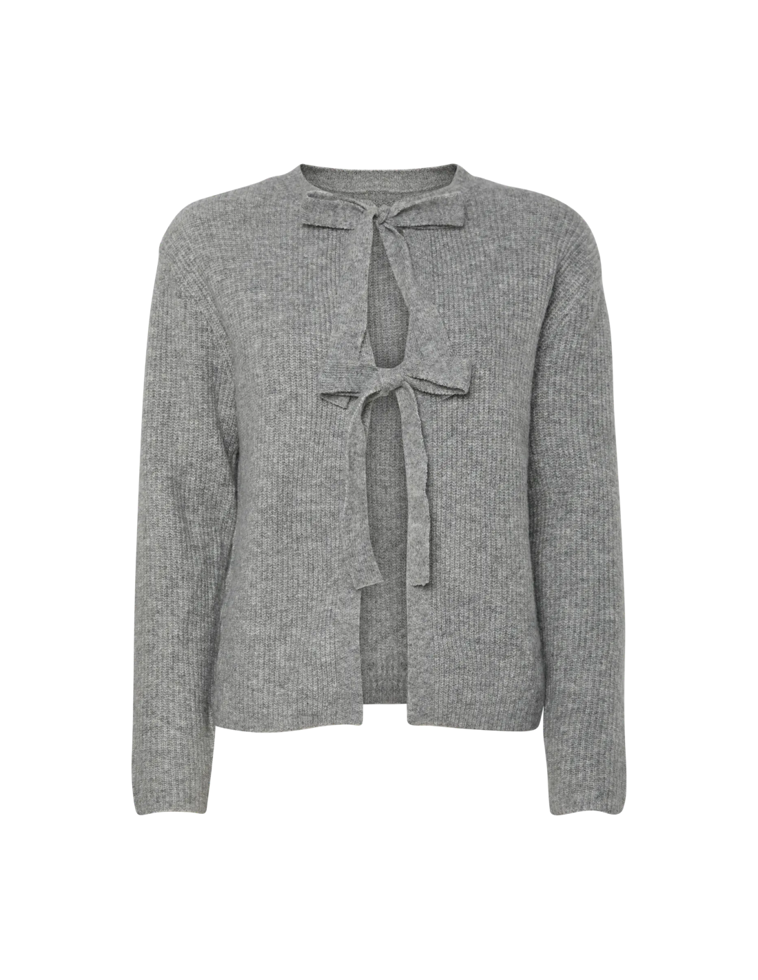 Rundhalsad kofta/tröja med knytband. Den går att vända och ha den med knytbanden framtill eller baktill.