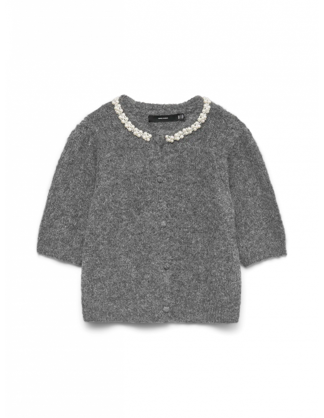 Fin stickad kofta från Vero Moda med 2/4 ärm och påsydda pärlor uppe vid halsen.