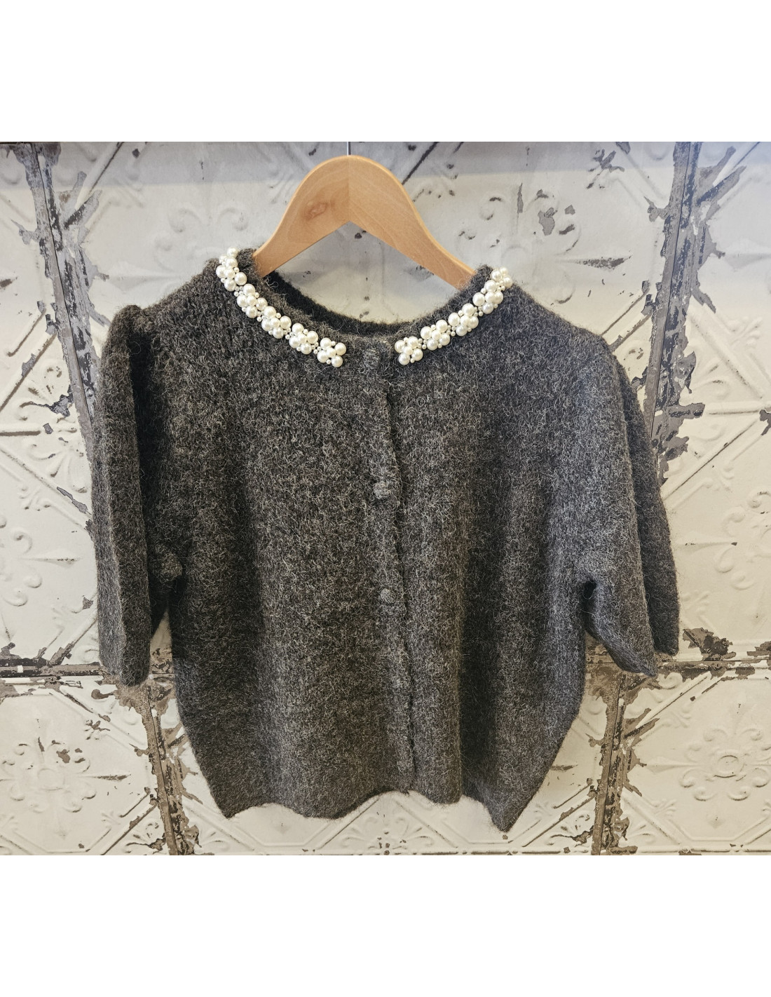 Fin stickad kofta från Vero Moda med 2/4 ärm och påsydda pärlor uppe vid halsen.