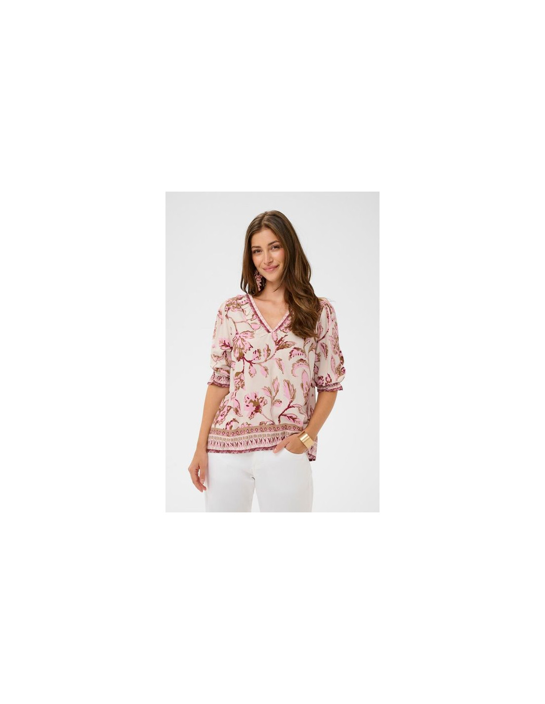V-ringad topp med 3/4 ärm med en liten volang och resår vid ärmslut
