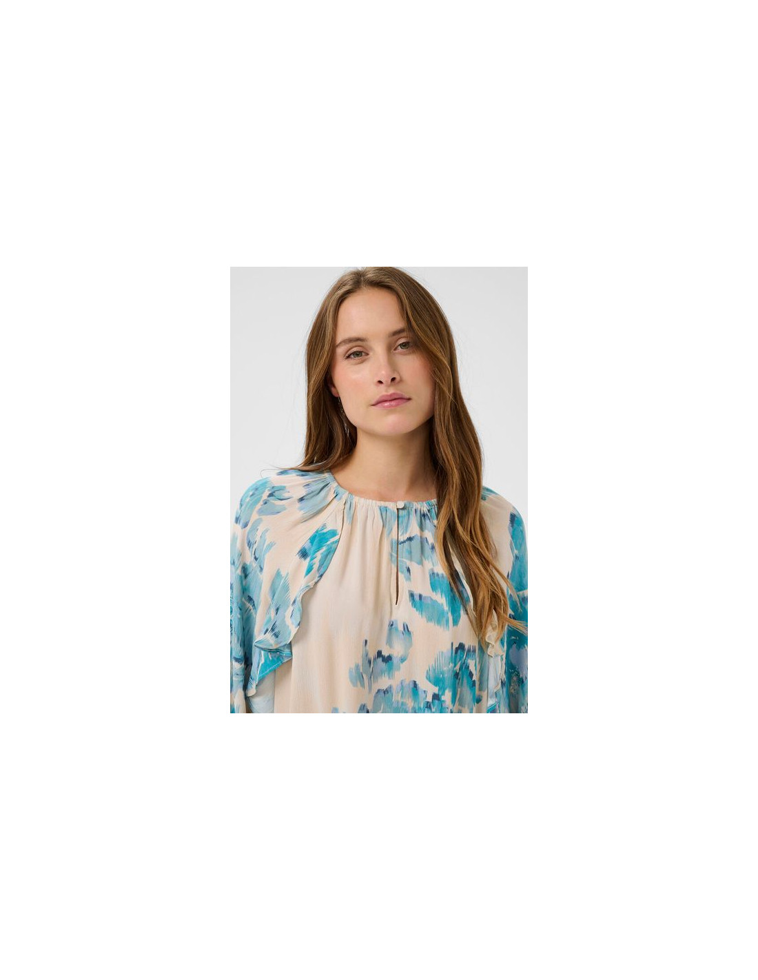 Rundhalsad topp med en knapp framtill. 3/4 ärm med volanger