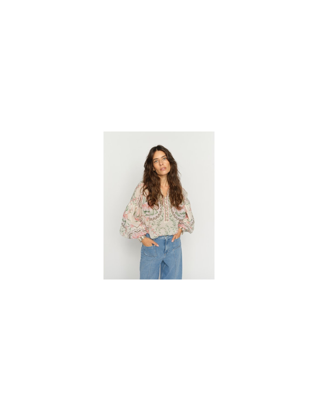 Underbar blus i skir kvalité med ballongärm. V-ringad med knappar framtill.