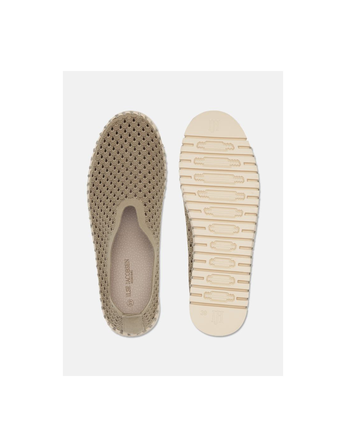 Ikoniska lättviktsskor från Ilse Jacobsen. Ovandelen är gjord av återvunnen mikrofiber och har ett fint laserskuret mönster.